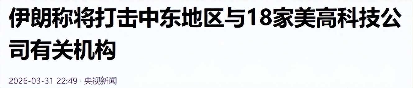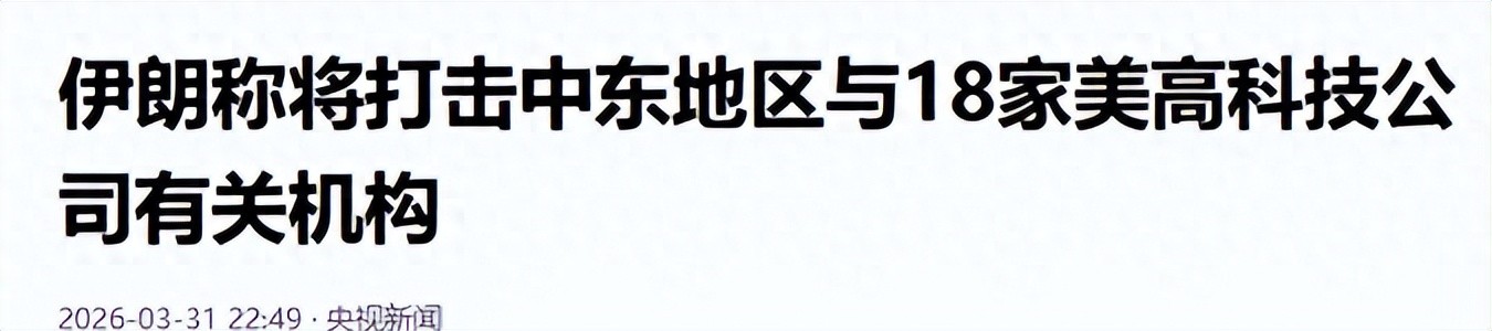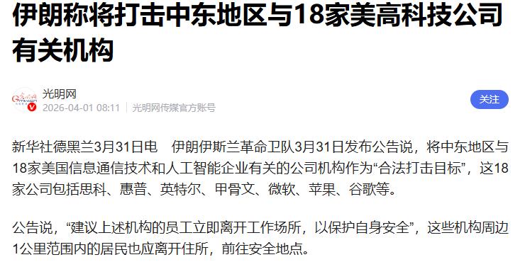 3月31日,伊朗伊斯兰革命卫队正式发布公告,宣布将中东地区与18家美国信息通信技术和人工智能企业有关的公司机构列为“合法打击目标”,这18家公司可不是什么小作坊,全是全球知名的科技巨头,包括思科、惠普、英特尔、甲骨文、微软、苹果、谷歌等,还有Meta、IBM、戴尔、帕兰蒂尔科技、英伟达、摩根大通、特斯拉、通用电气、波音等企业。