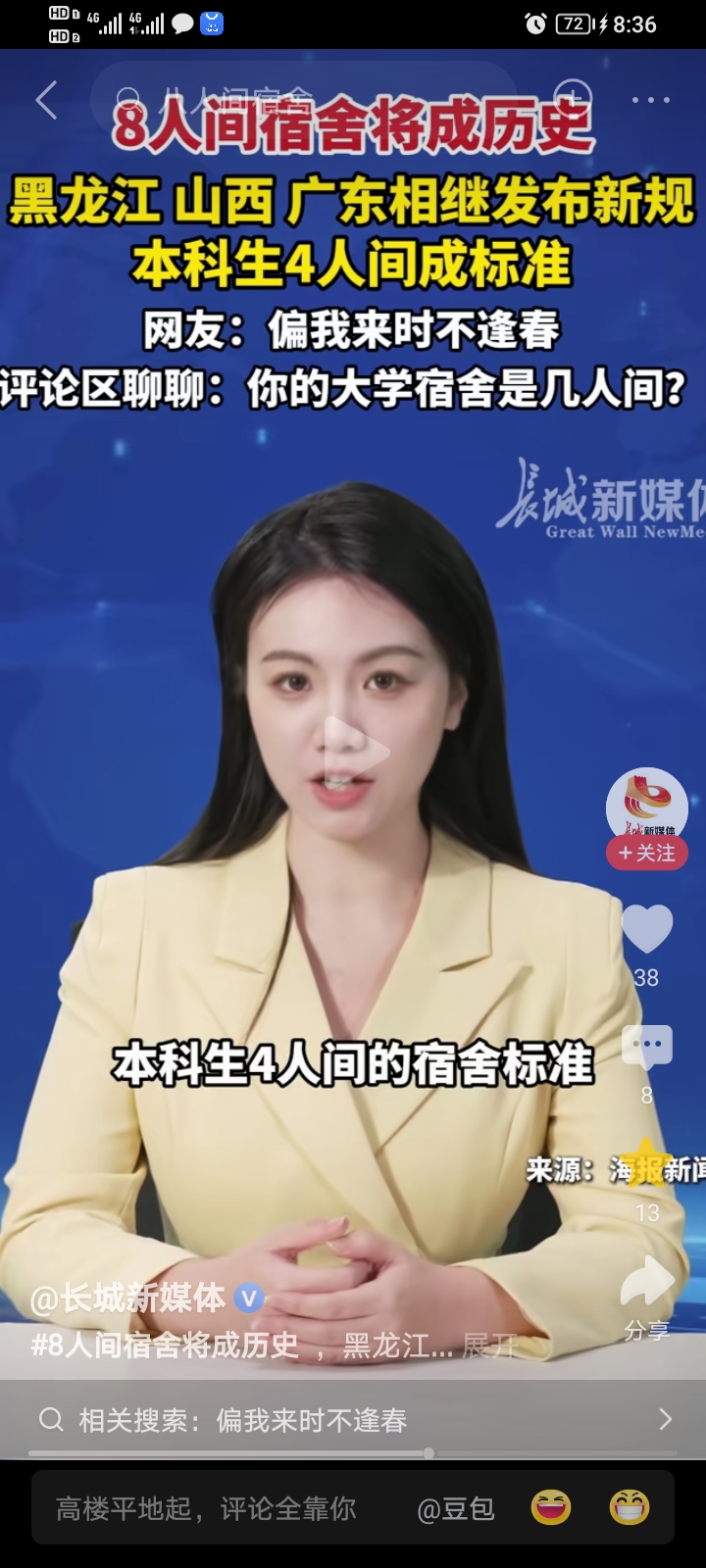 目前黑龙江已经明确出台相关政策,相信后续会有更多省份跟进,逐步淘汰本科8人间宿舍。对于大学宿舍取消8人间、统一4人间标准这件事,你怎么看?你当年上大学住的是几人间?欢迎在评论区分享你的经历和看法。