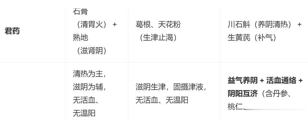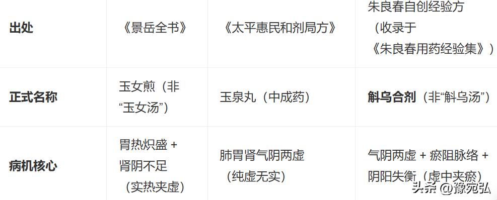| 维度 | 玉女煎 | 玉泉丸 | 朱良春斛乌合剂 |