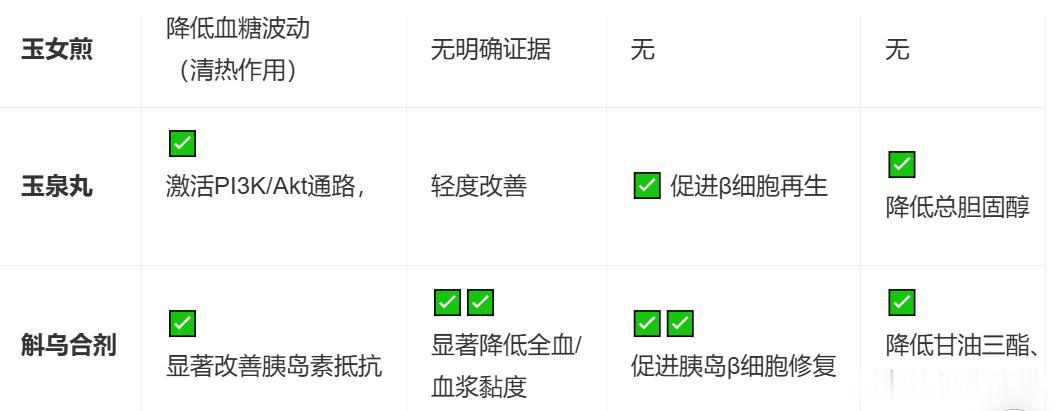 注:玉泉丸与斛乌合剂均具胰岛功能修复潜力,但斛乌合剂在改善血液流变学、抗瘀阻方面优势显著,为治疗糖尿病并发症的核心方剂。