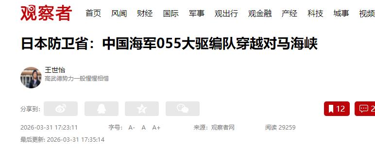 055 编队穿越对马海峡 日本海自全程紧绷 军事警示直指台海要害日本防卫省统合幕僚监部在 3 月 31 日发布紧急通报,确认中国海军一支现代化舰艇编队已于 3 月 30 日至 31 日期间,顺利穿越对马海峡进入日本海海域。