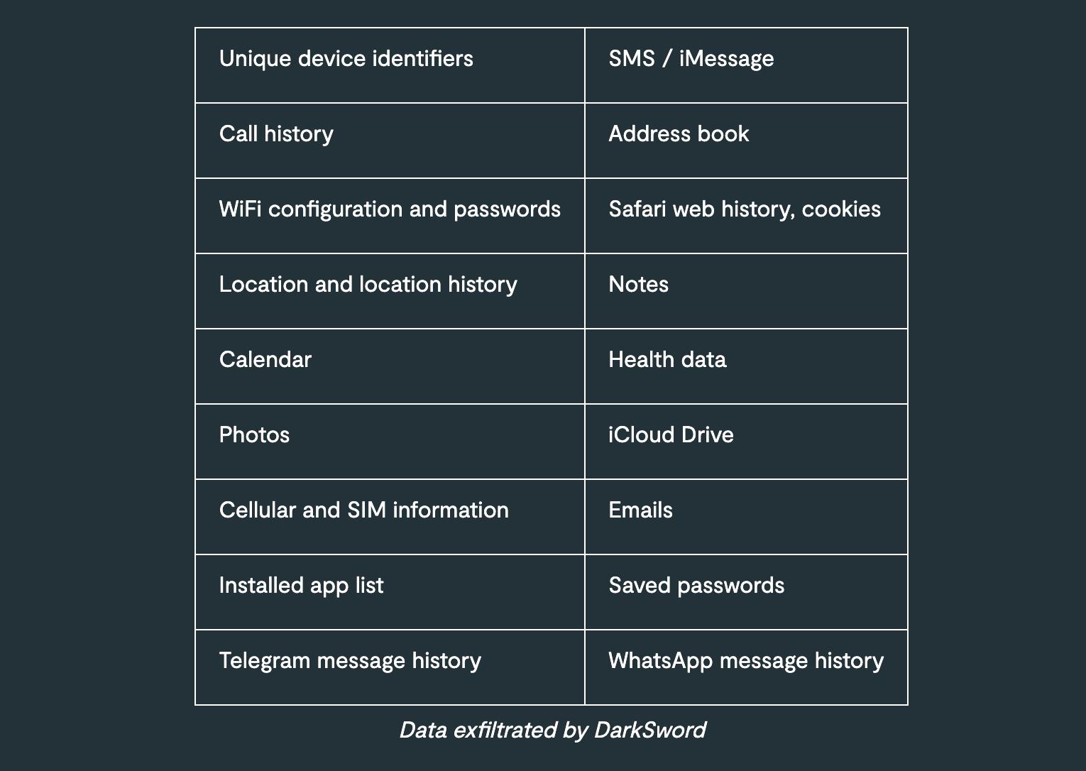 DarkSword_窃取的信息,来自 Lookout 分析报告
