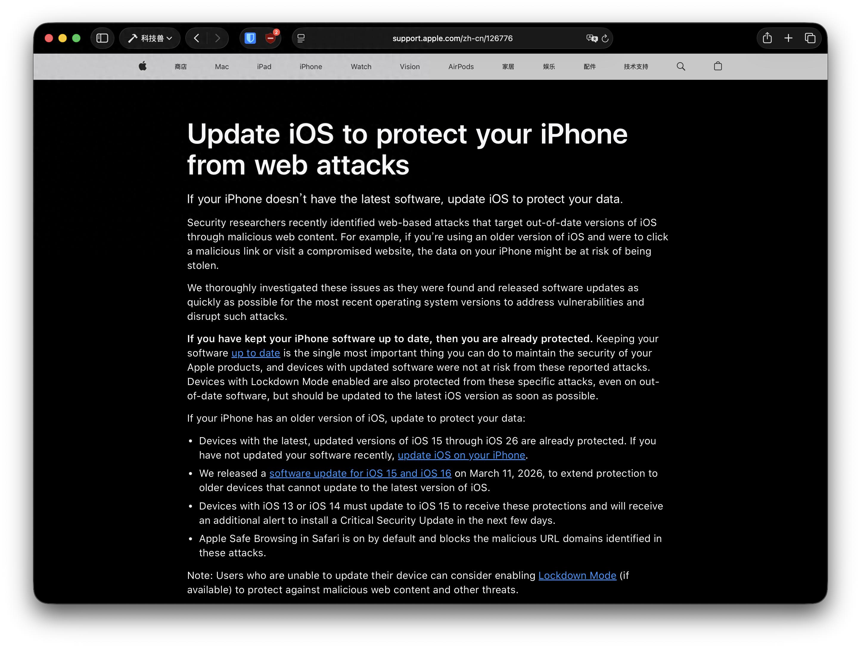 苹果在安全文档中表示,已对相关问题完成调查,并通过系统更新修复漏洞、阻止攻击。