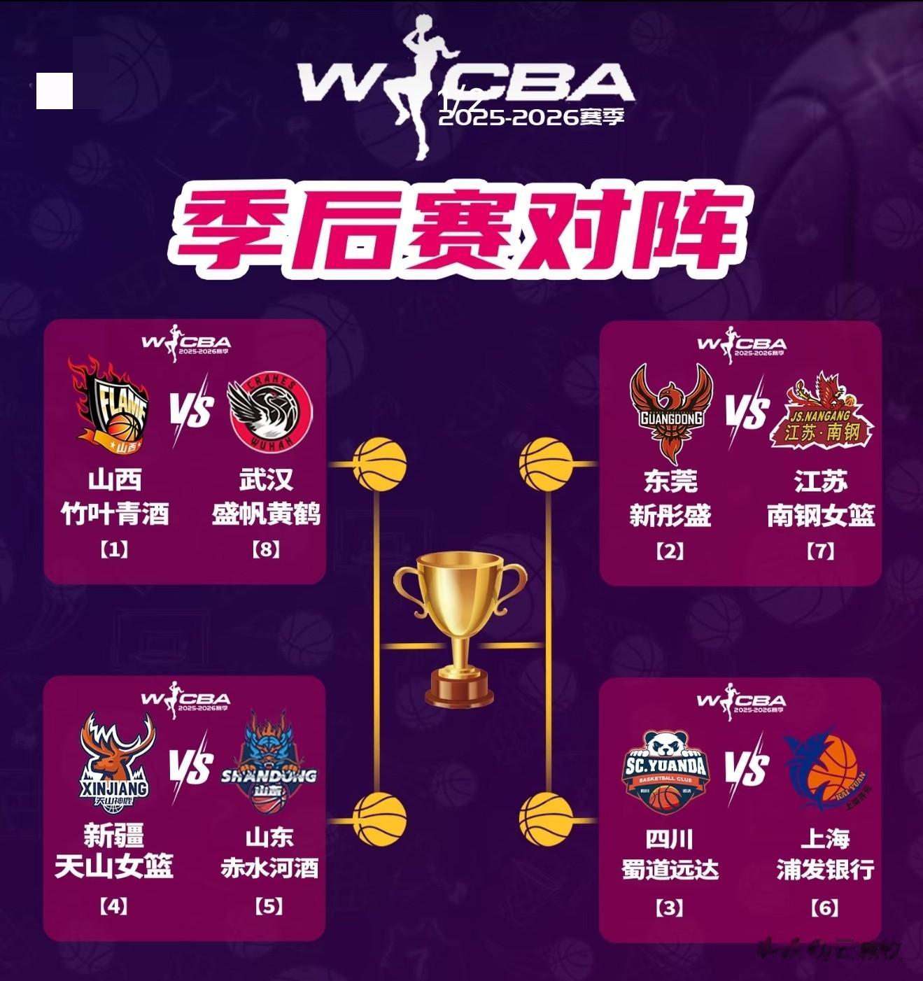 WCBA全明星赛结束后不久,联赛常规赛8强就要在3月26日开启季后赛的征程。依据分组规则,WCBA季后赛按照常规赛成绩分为上下半区。上半区为山西女篮(第1)VS武汉女篮(第8),新疆女篮(第4)VS山东女篮(第5)。下半区为东莞女篮(第2)VS 江苏女篮(第7),四川女篮(第3)VS上海女篮(第6)。下面小编就季后赛首轮晋级情况做一预测。