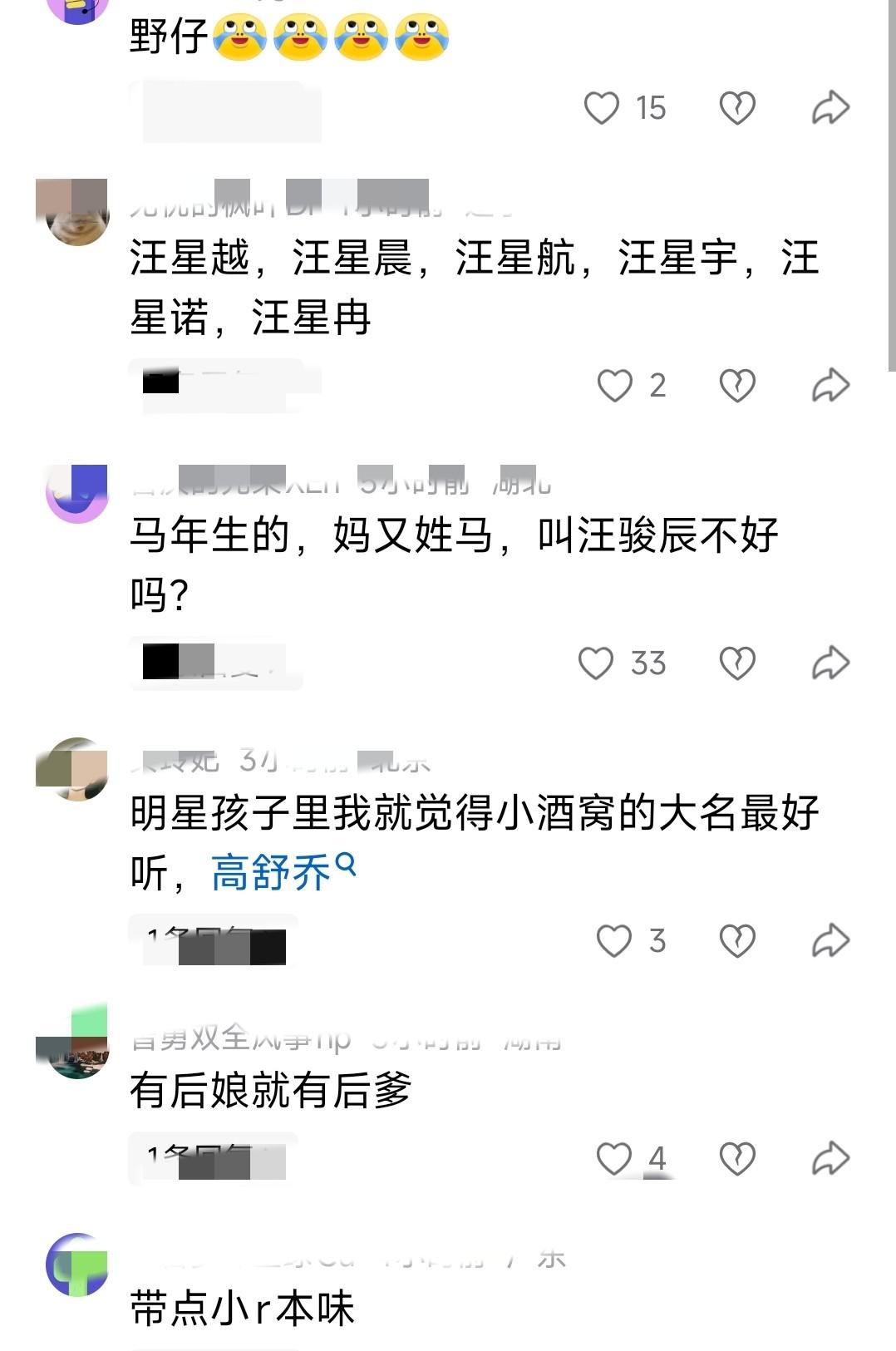 汪小菲和马筱梅的孩子小名叫汪宝儿,大名叫汪星野,不按照前面两个孩子的辈分走,与汪希玥,汪希霖区别开。