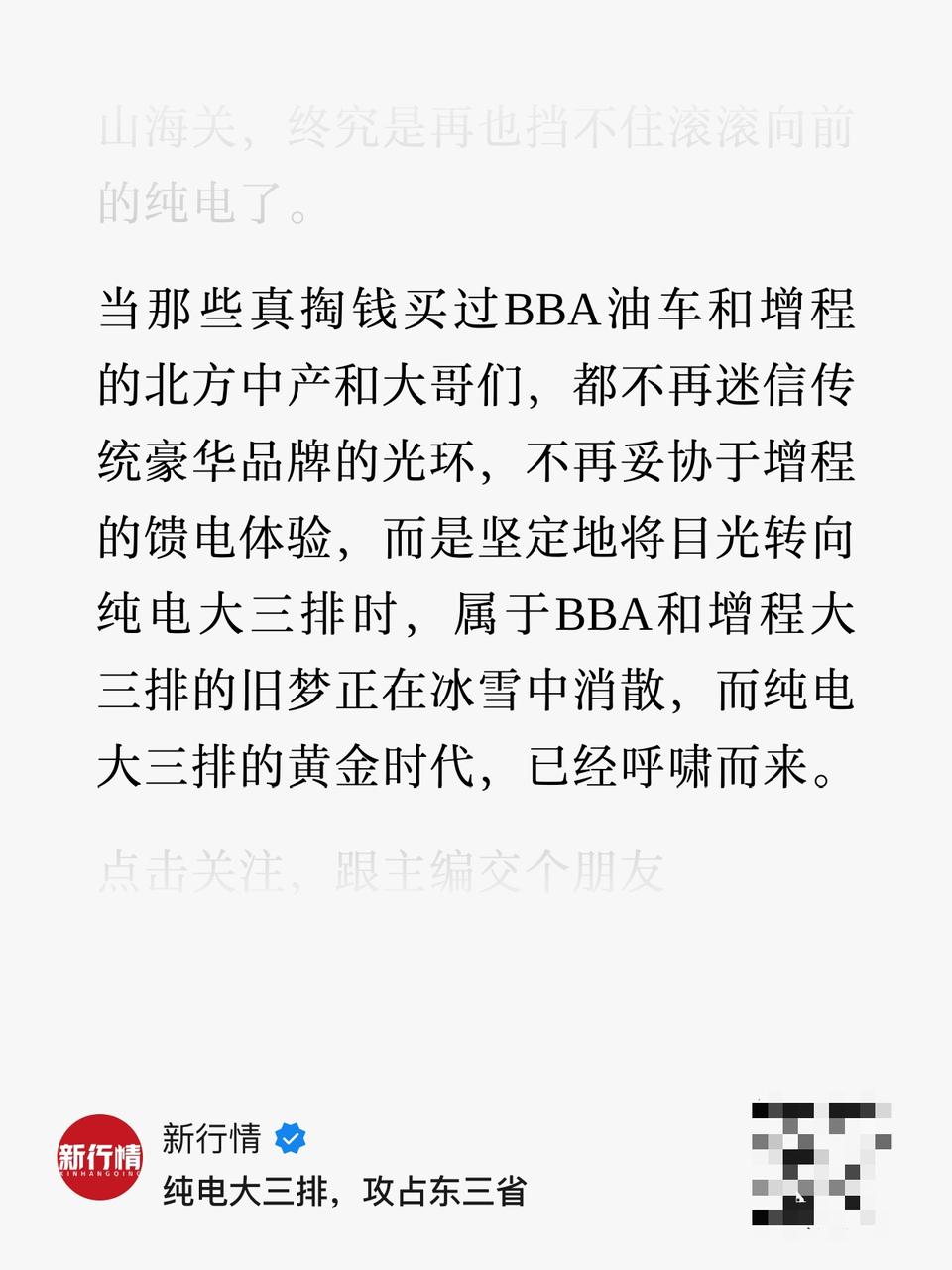 东北人买车最实在——花了钱,就得买个舒心、买个实用。当纯电大车在续航、补能、成本、体验上全面超越增程和燃油车时,用钱包投票就成了最自然的选择。正如欧阳明高所言,纯电汽车的优势正在持续增强,全气候超充等技术突破,正在让“不过山海关”成为历史。