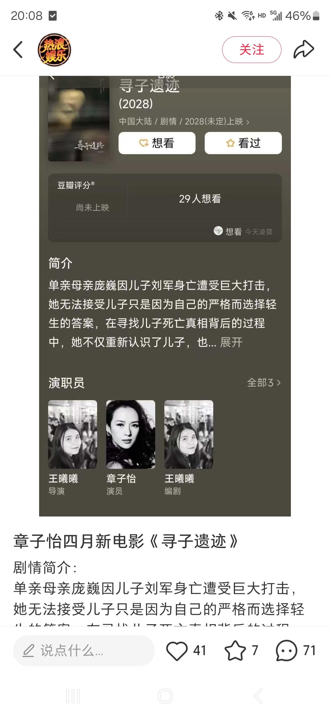 武汉街头遇到了剧组在这里拍电影,主演居然是大明星章子怡,她梳着蓬乱的微卷短发,穿着灰栗色的衬衫和牛仔裤, 她发缝稀疏头顶有白发,鼻梁上还架了一副眼镜造型十分老气,她正在拍的这部戏名字叫《寻子遗迹》。