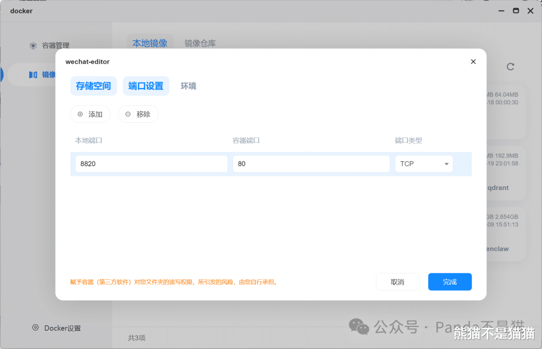正如前面说的,不涉及后端以及数据库,所以整个项目并不需要配置复杂的变量以及映射。点击创建容器,命名之后只需要映射容器端口80就行,端口类型选择TCP,其他的不需要设置。