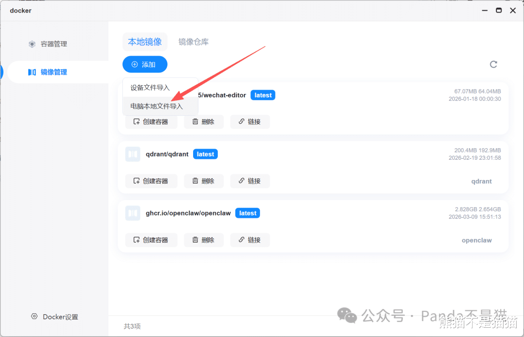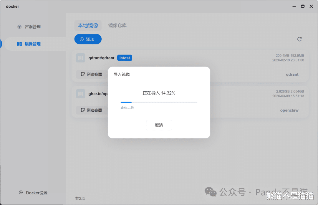 随后打开海康智存的Docker界面,来到镜像管理界面点击添加,再点击电脑文件导入。