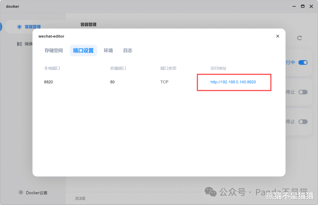 最后浏览器输入http://R1的IP:映射端口就能用。或者在容器管理界面点击容器的详情,端口设置中也能看到地址,点击就能直达。
