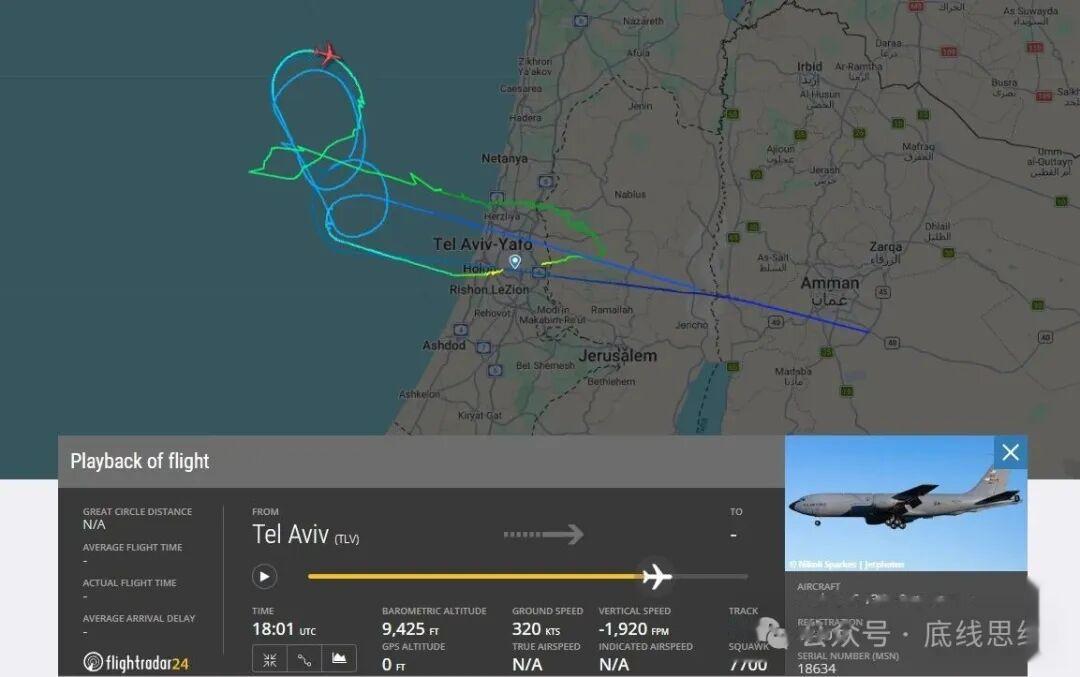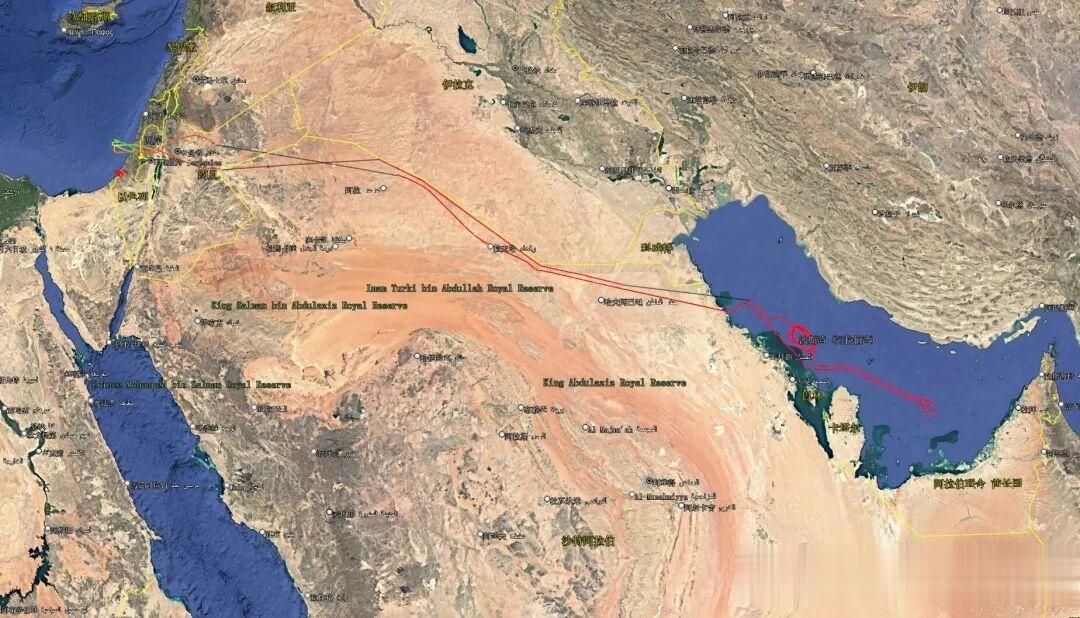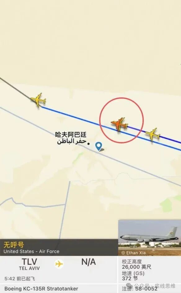 从这架没关应答机的KC135飞行轨迹,我们可以看出其从特拉维夫起飞后,就沿着沙特与伊拉克边境飞往波斯湾上空,并在波斯湾上空建立加油区。在完成加油任务后再返回特拉维夫,前后耗时七八个小时。