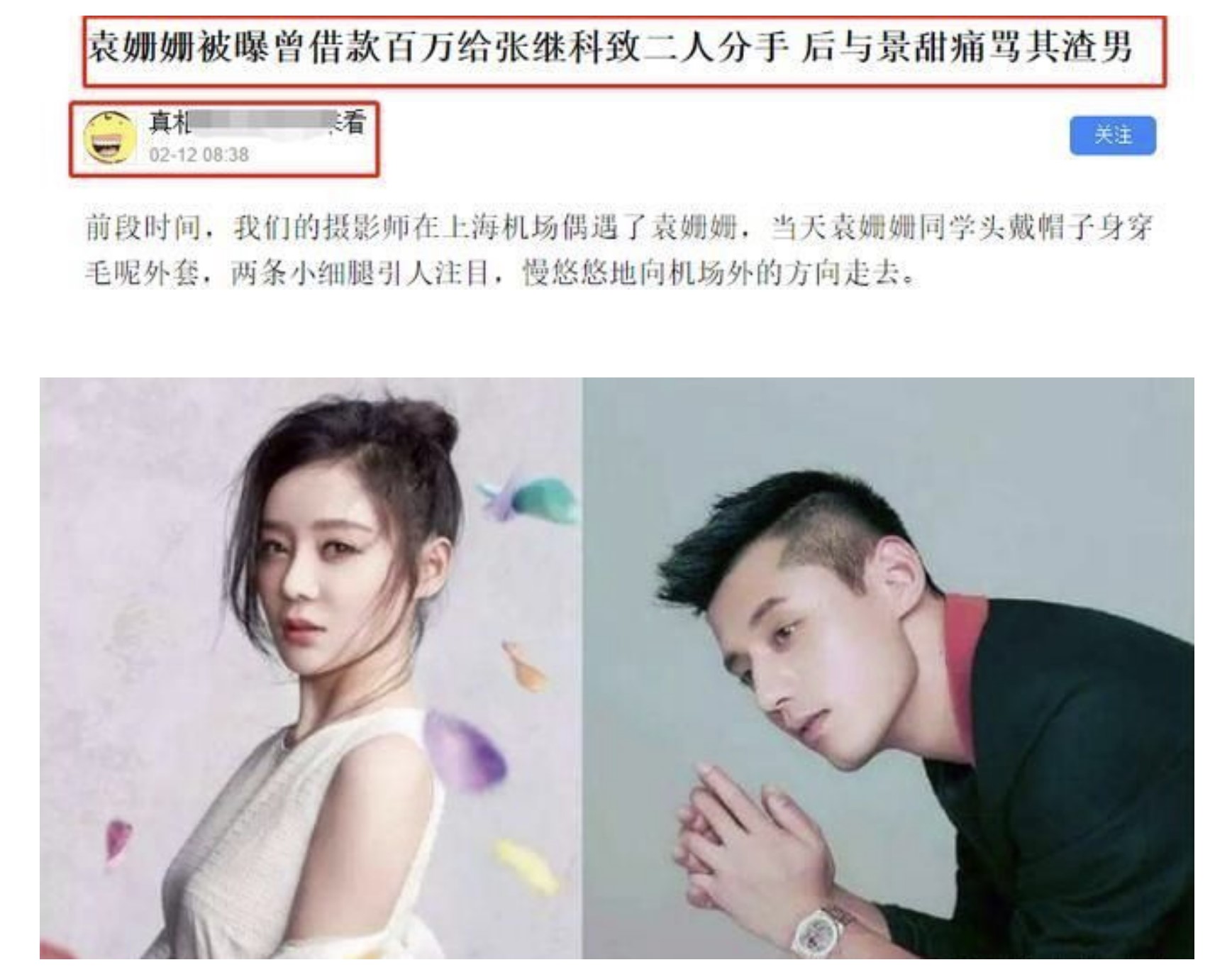 网络爆料称张继科以各种理由向袁姗姗累计借款数百万,导致二人分手,不过均无官方实锤。