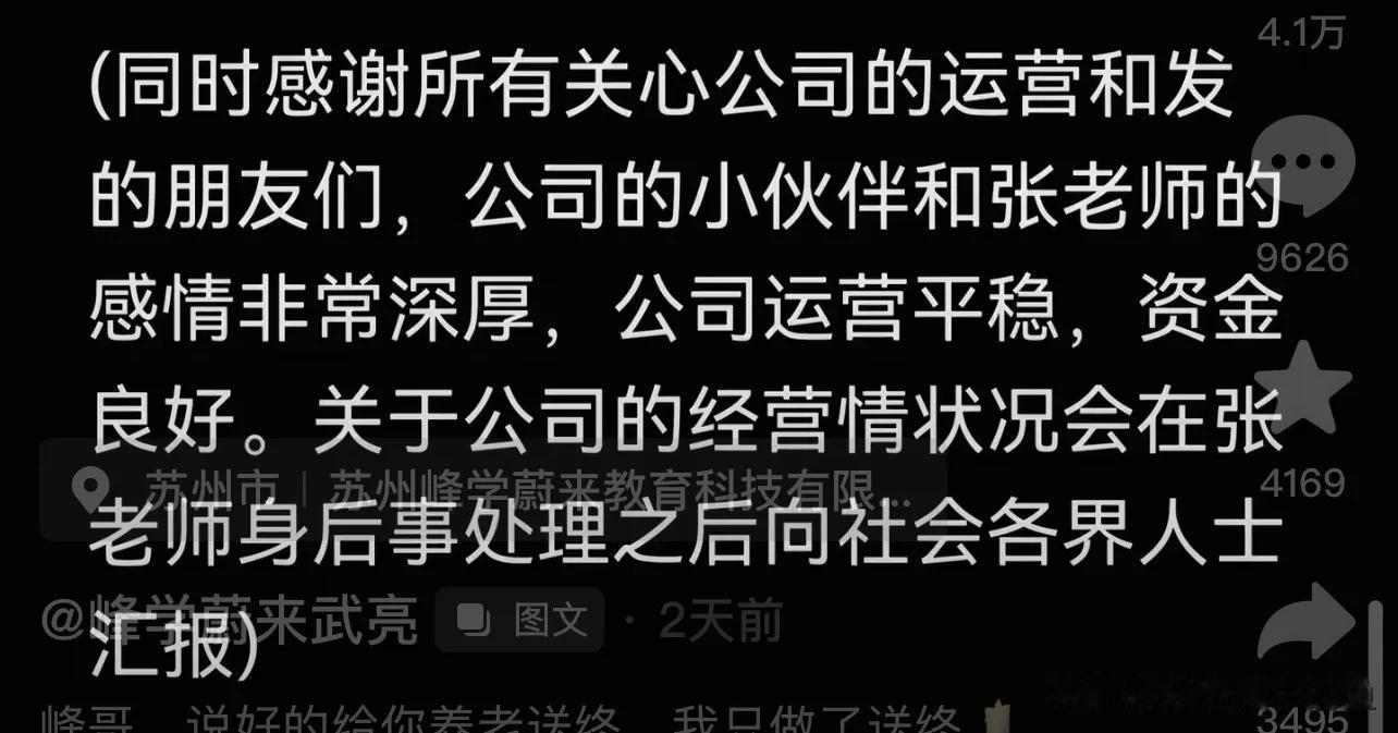 武亮明确表示,张雪峰老师打下的这片江山,不会因为他的离开而分崩离析,公司将保持正常运营,服务有序、员工权益有保障。