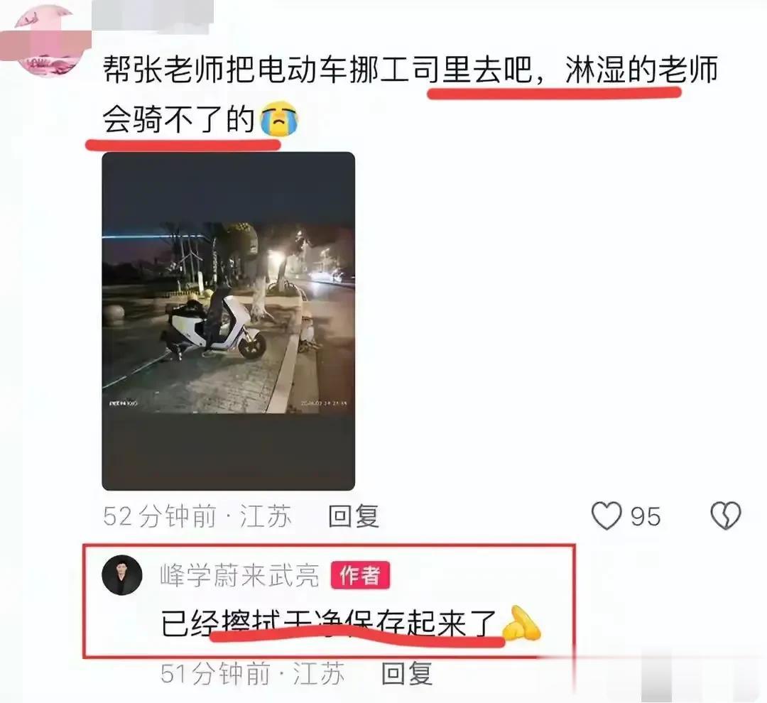 评论区有网友称张老师的电动车还停在路边,风吹日晒,看到有些伤心。