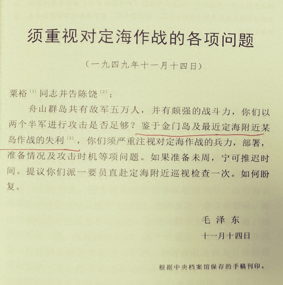 1949年11月14日,毛泽东在致华东军区兼三野副司令员粟裕并华东军区司令员兼三野司令员及政委陈毅、华东军区政委饶簌石的电文中指出:“舟山群岛共有敌军五万人,并有颇强的战斗力,你们以两个半军进行攻击是否足够?鉴于金门岛及最近定海附近某岛作战的失利,你们须严重注视对定海作战的兵力,部署, 准备情况及攻击时机等项问题。如果准备未周,宁可推迟时间。提议你们派一要员直赴定海附近巡视检查一次。如何盼复。”该电文收录《毛泽东军事文集》时,命名为《须重视对定海作战的各项问题》。