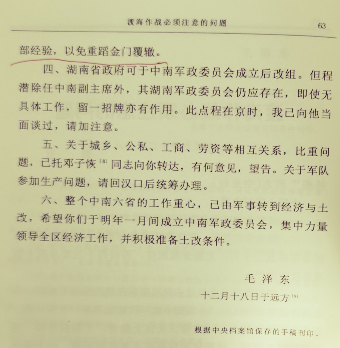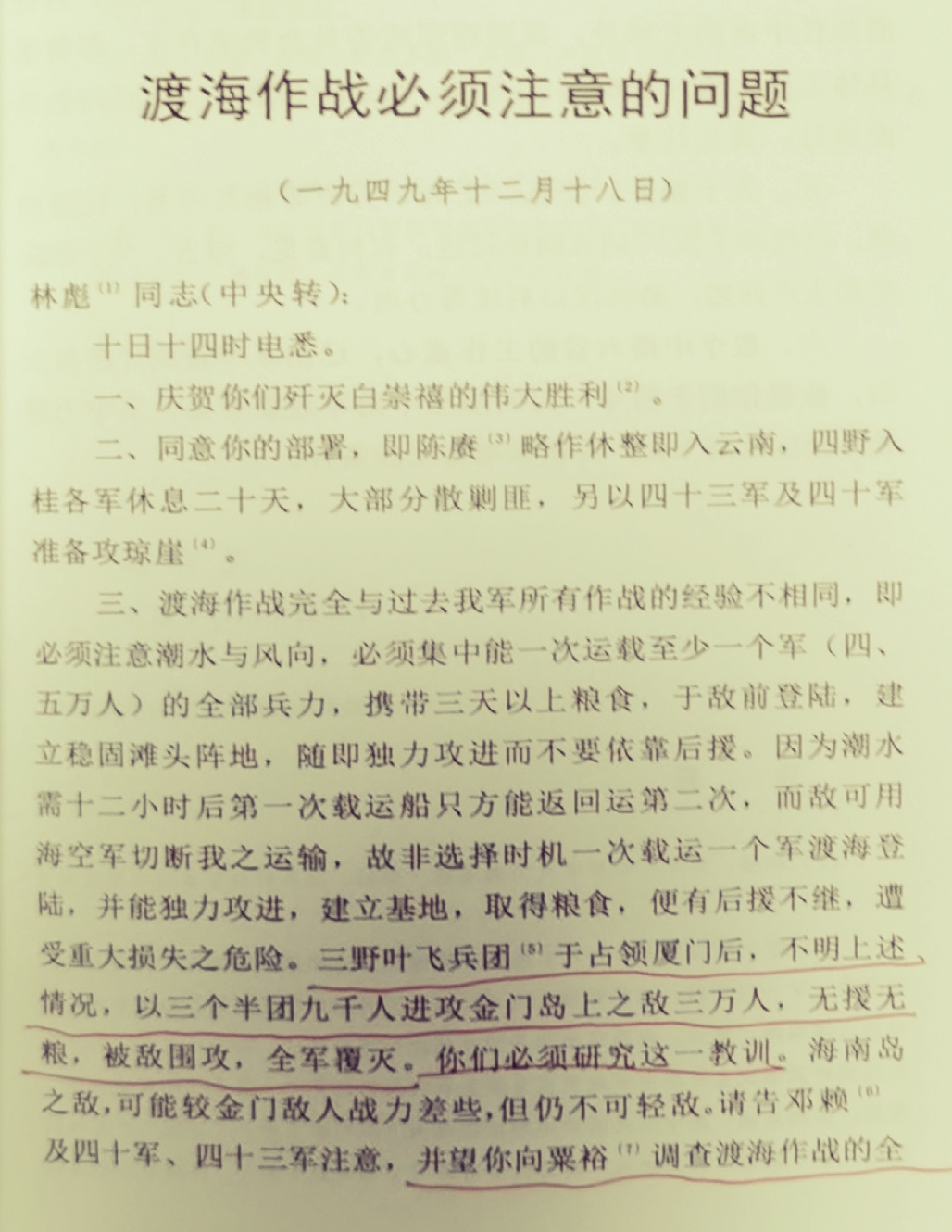 该指示电,后收录《毛泽东军事文集》时命名为《渡海作战必须注意的问题》,其中第三点具体如下:“三、渡海作战完全与过去我军所有作战的经验不相同,即必须注意潮水与风向,必须集中能一次运载至少一个军(四、五万人)的全部兵力,携带三天以上粮食,于敌前登陆,建立稳固滩头阵地,随即独力攻进而不要依靠后援。因为潮水需十二小时后第一次载运船只方能返回运第二次,而敌可用海空军切断我之运输,故非选择时机一次载运一个军渡海登陆,并能独力攻进,建立基地,取得粮食,便有后援不继,遭受重大损失之危险。三野叶飞兵团于占领厦门后,不明上述情况,以三个半团九千人进攻金门岛上之敌三万人,无援无粮,被敌围攻,全军覆灭。你们必须研究这一教训。海南岛之敌,可能较金门敌人战力差些,但仍不可轻敌。请告邓赖 及四十军、四十三军注意,并望你向粟裕调查渡海作战的全部经验,以免重蹈金门覆辙。”