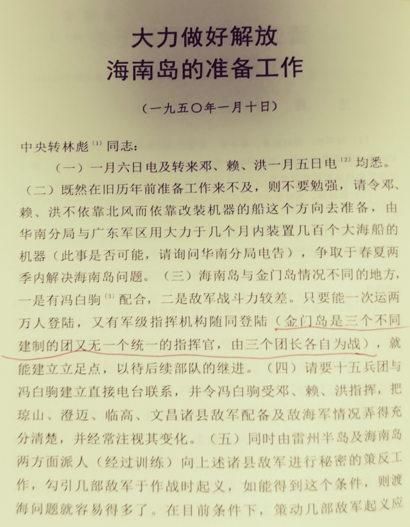 电文如下:“(一)一月六日电及转来邓、赖、洪一月五日电均悉。(二)既然在旧历年前准备工作来不及,则不要勉强,请令邓、 赖、洪不依靠北风而依靠改装机器的船这个方向去准备,由华南分局与广东军区用大力于几个月内装置几百个大海船的机器(此事是否可能,请询问华南分局电告),争取于春夏两季内解决海南岛问题。(三)海南岛与金门岛情况不同的地方, 一是有冯白驹配合,二是敌军战斗力较差。只要能一次运两万人登陆,又有军级指挥机构随同登陆(金门岛是三个不同建制的团又无一个统一的指挥官,由三个团长各自为战),就能建立立足点,以待后续部队的继进。(四)请要十五兵团与冯白驹建立直接电台联系,并令冯白驹受邓、赖、洪指挥,把琼山、澄迈、临高、文昌诸县敌军配备及敌海军情况弄得充分清楚,并经常注视其变化。(五)同时由雷州半岛及海南岛两方面派人(经过训练)向上述诸县敌军进行秘密的策反工作,勾引几部敌军于作战时起义,如能得到这个条件,则渡海问题就容易得多了。在目前条件下,策动几部敌军起义应该是很可能的。此事应请剑英、方方、冯白驹诸同志特别注意用力。华南分局应加以讨论,定出具体的策反办法,并于三四个月内获得成绩。”