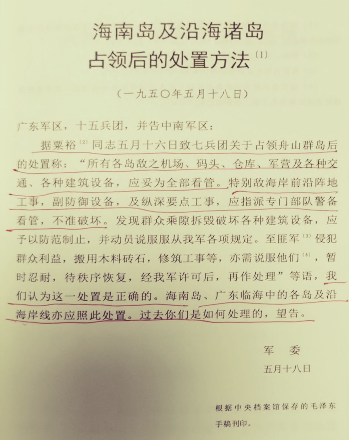 1950年5月18日,毛泽东致电广东军区、十五兵团,并告中南军区,就海南岛及沿海诸岛如何处置作了专门的指示,这一电文后来收录《毛泽东军事文集》中时命名为《海南岛及沿海诸岛占领后的处置方法》。