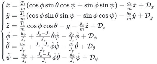 四旋翼无人机(QUAV)的动力学模型是强非线性、高耦合、欠驱动的: