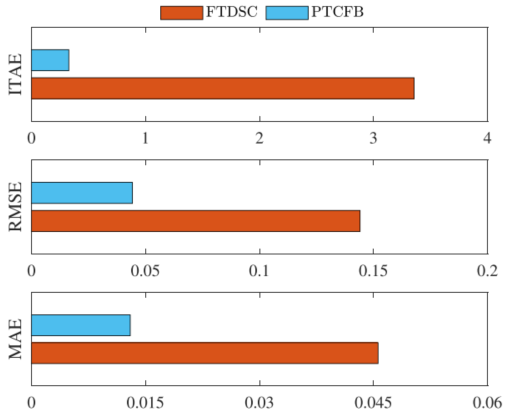 图7是三个性能指标(ITAE、RMSE、MAE)的对比。PTCFB 在三个指标上都优于 FTDSC,说明控制精度更高。