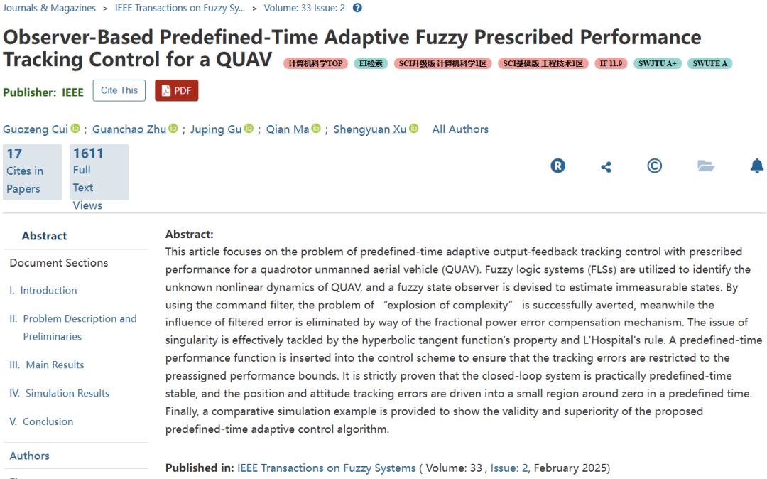 引文格式:Cui G, Zhu G, Gu J, et al. Observer-Based Predefined-Time Adaptive Fuzzy Prescribed Performance Tracking Control for a QUAV[J]. IEEE Transactions on Fuzzy Systems, 2025, 33(2): 786-796.