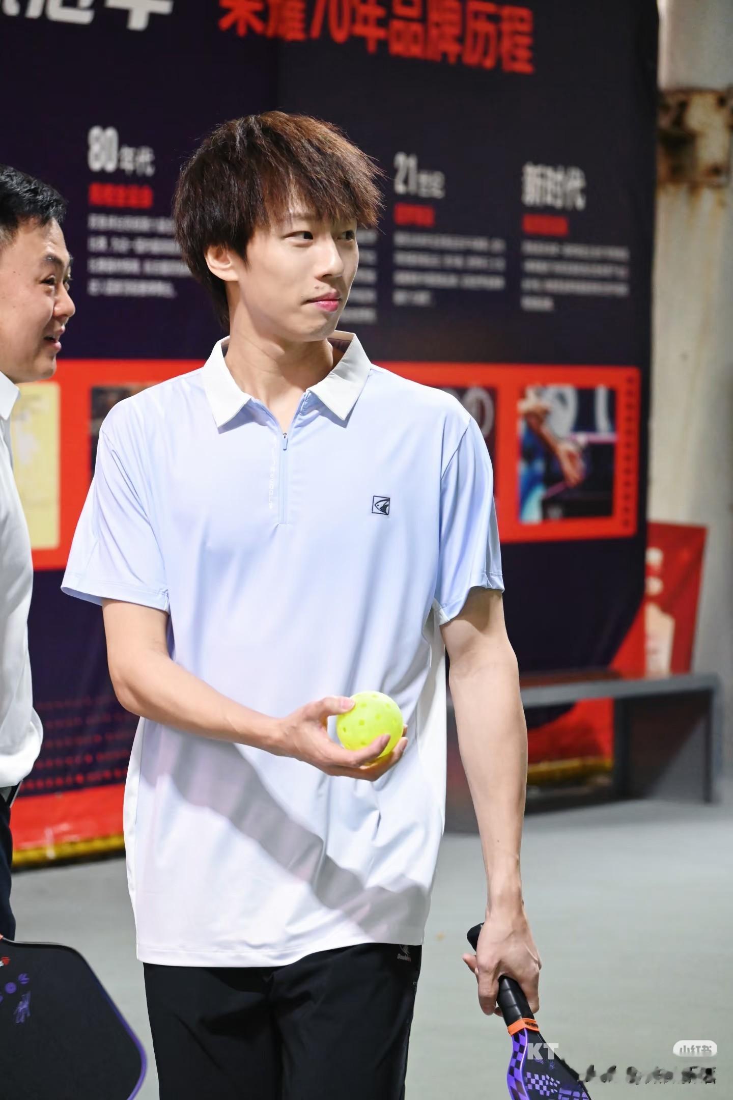 这件短袖也好看呢,林高远今天来了也要打一场匹克球,这个球的大小和网球差不多吧,高远真的有在尝试很多新的东西,他也有在学习网球。