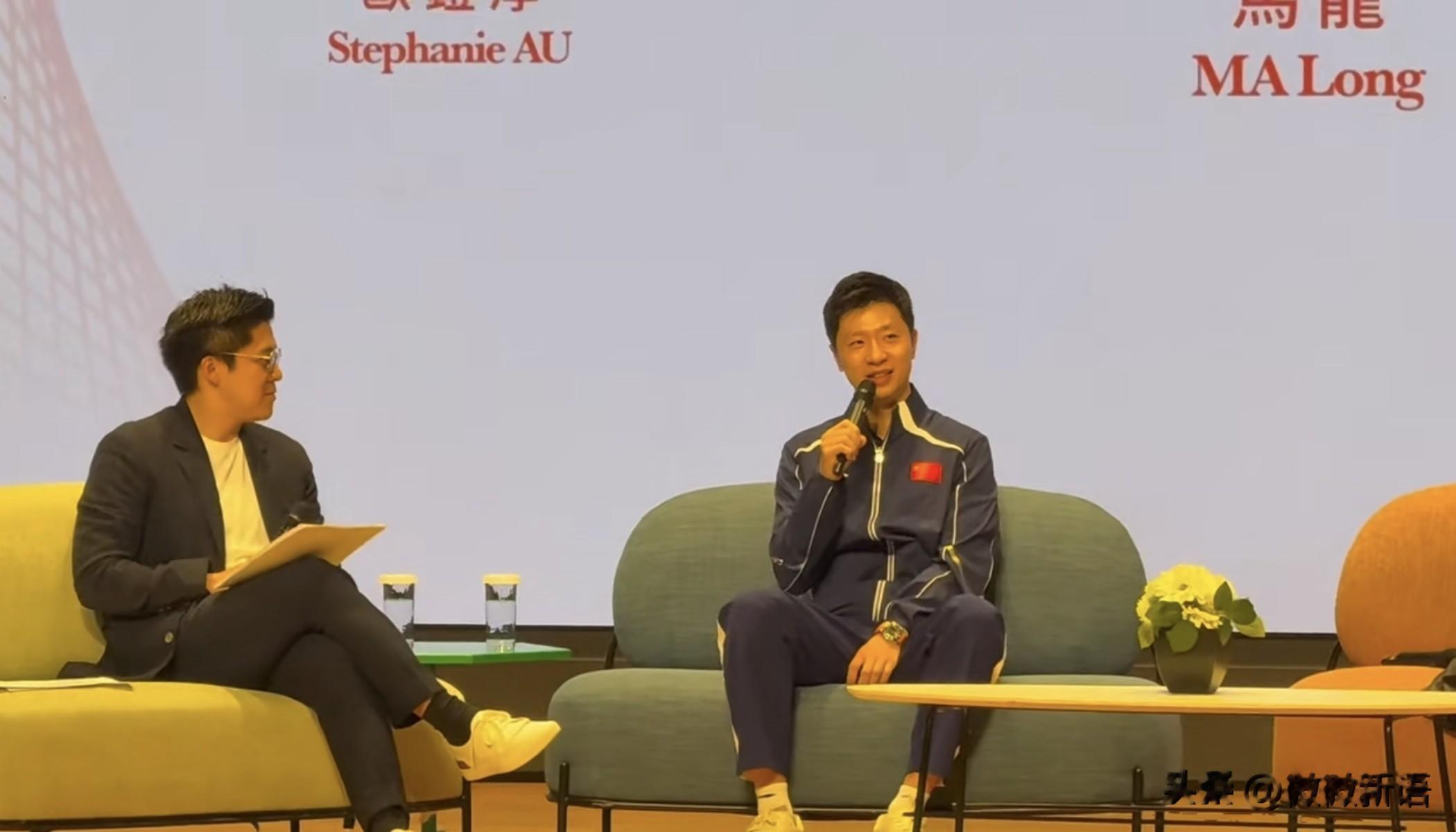 在采访环节,马龙也还是很幽默的,当霍启刚问马龙:“我是叫你马龙还是龙队呢?龙队吧。”马龙笑着说:“你叫什么都对”。然后把台下的人也逗笑了,这时霍启刚说:“好兄弟,好兄弟”。
