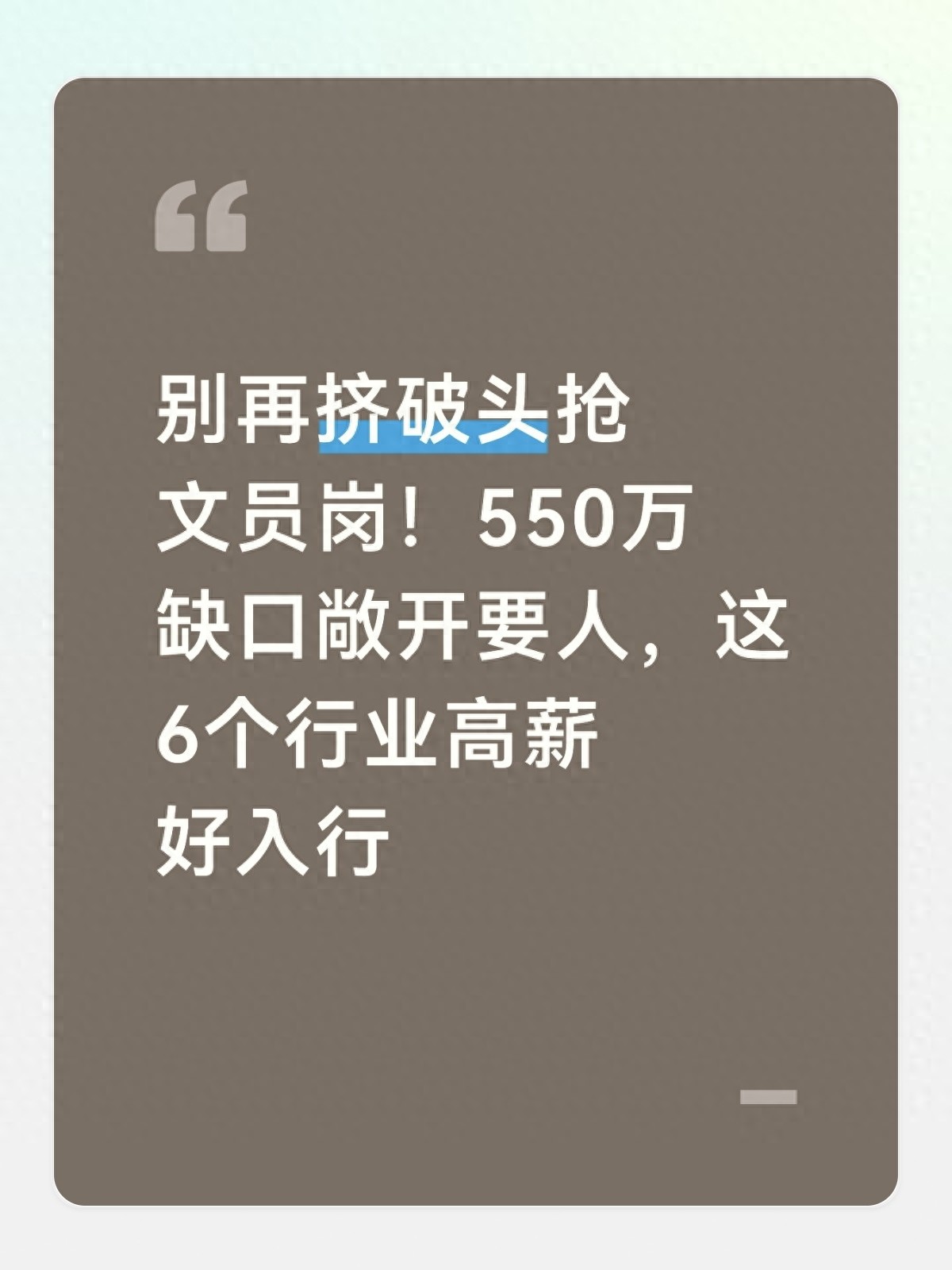 可我翻遍人社部2026年一季度数据、各大行业报告,发现一个扎心真相:不是没工作,是你挤错了赛道!传统办公室文员、基础客服、普通销售,几百人抢一个岗;但另一边,安全应急、新能源、养老护理等6大领域,合计550万人才缺口,企业高薪招人都招不满,岗位挂半年都没人来。