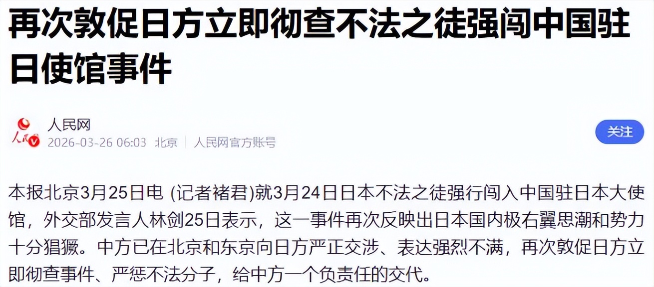 中方选择在这个时间点果断出手,是因为近期日方一系列不负责任的行为层层叠加,已经彻底触碰了中方的忍耐底线。就在反制措施出台的前六天,也就是3月24日,发生了一件性质极其恶劣的恶性事件:一名日本陆上自卫队的现役军官,竟然持刀强行闯入中国驻日本大使馆,公然威胁中方外交人员的人身安全。