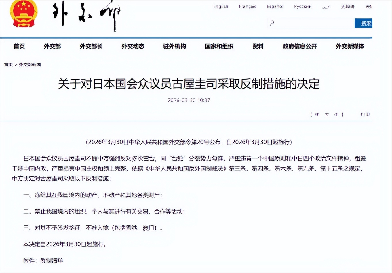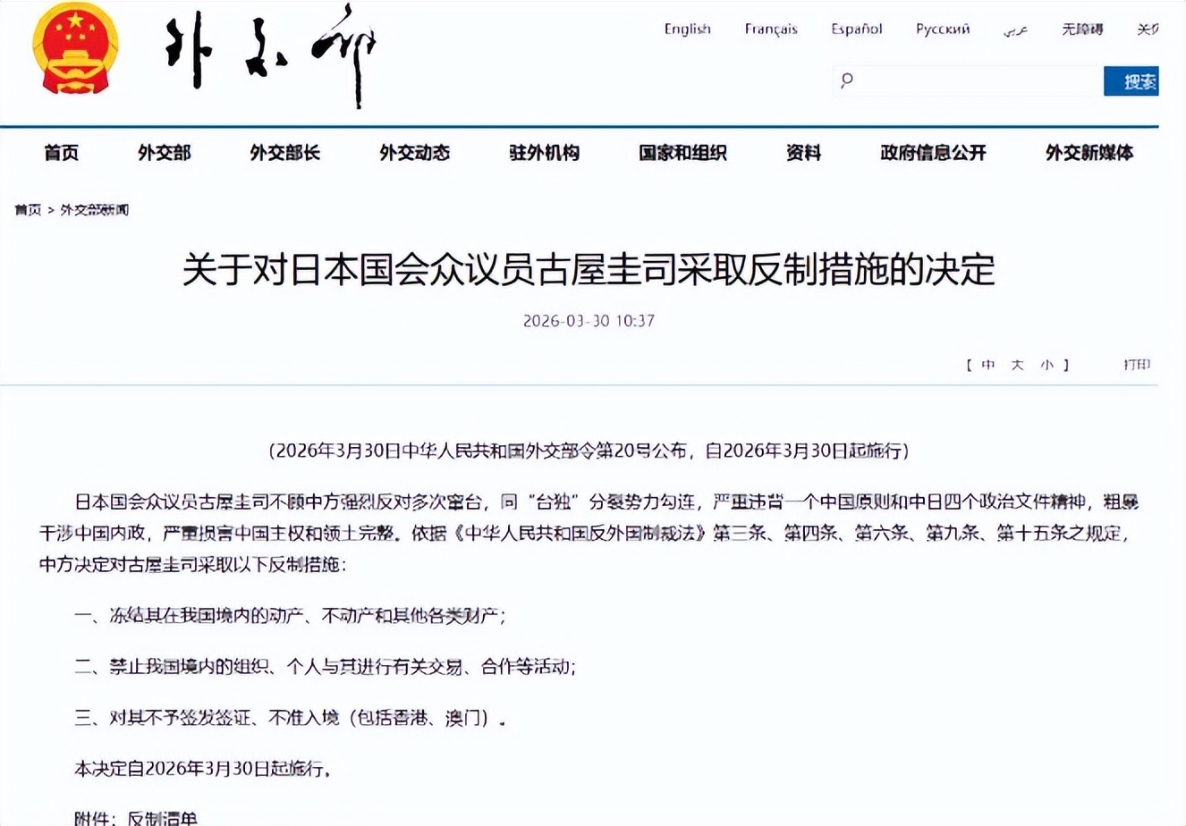 此次中方的反制行动,绝非临时起意的意气用事,而是严格依照法律、有理有据的正当维权。根据外交部发布的第20号令,从3月30日当天起,中方对古屋圭司启动三项实打实的反制措施:第一,彻底冻结他在中国境内的动产、不动产以及所有类型的财产,让其在华资产彻底无法动用;