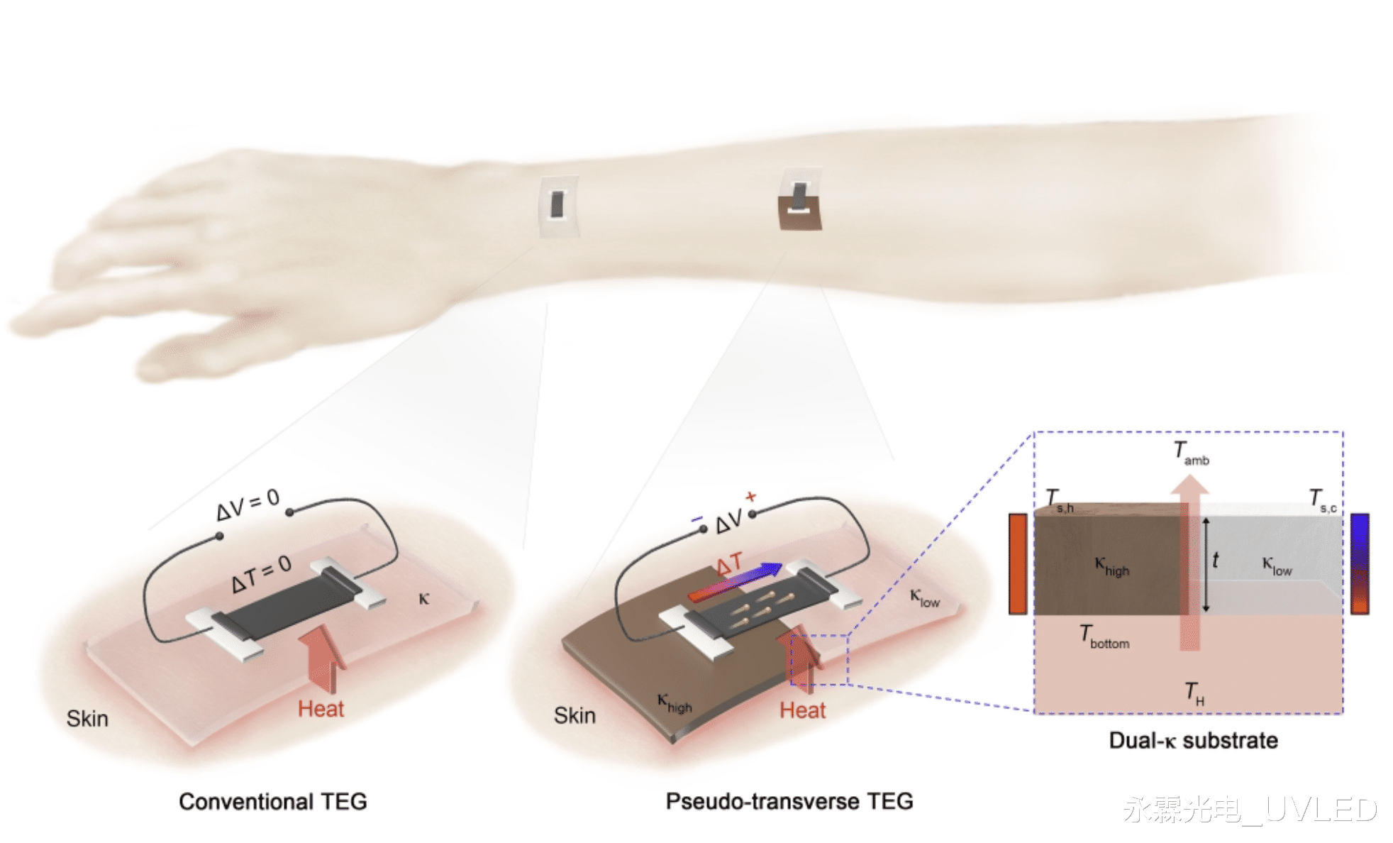 当热电半导体放置在这些区域的边界时,来自皮肤的热量不会垂直逸出,而是沿着高热导率区域横向流动。结果,基板表面形成了相对温暖和凉爽的区域,从而产生了温差,使得即使在薄膜结构中也能实现发电。