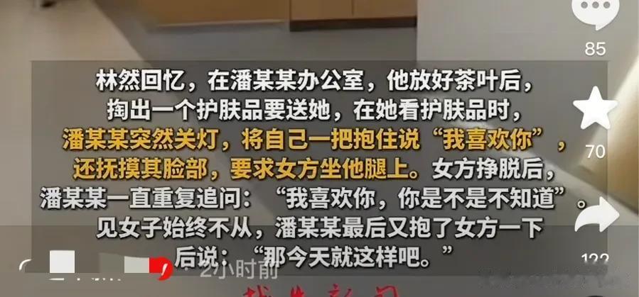 林然拼尽全力才挣脱开,本以为能就此离开,可潘某某依旧不依不饶,纠缠了好一会儿,最后又强行抱了她一次,才冷冷说了句那今天就这样吧,放她出了办公室。