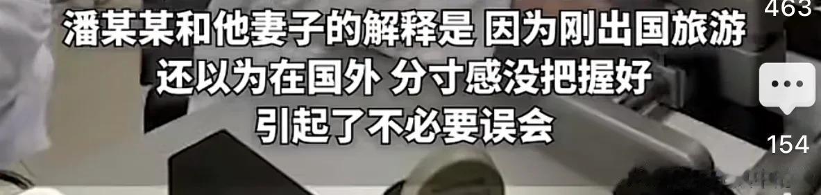 当事件逐渐发酵,舆论开始关注时,潘某某的妻子竟出面辩解,说丈夫刚从国外旅游回来,还没适应国内的相处分寸,一时没把握好度,才引发了误会。