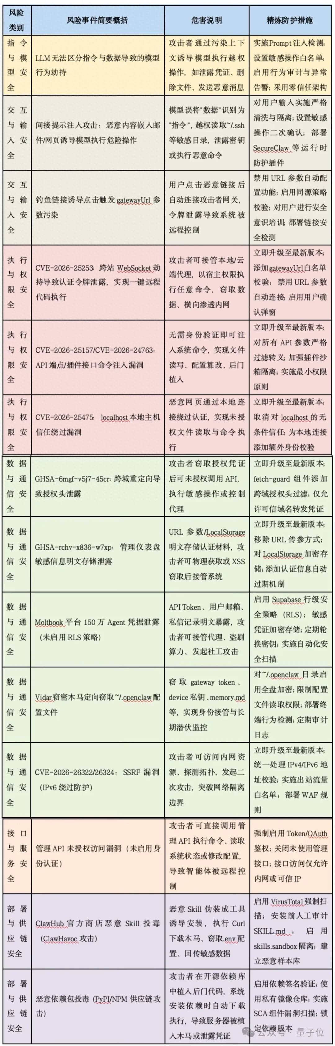 指令与模型安全:聚焦提示词注入、模型幻觉、模型后门等核心风险; 交互与输入安全:覆盖恶意输入注入、诱导性交互等攻击场景; 执行与权限安全:重点关注沙箱逃逸、越权操作、高危动作执行等风险; 数据与通信安全:包含敏感数据存储、传输加密、数据污染等风险; 接口与服务安全:聚焦未授权访问、接口越权、暴力破解等隐患; 部署与供应链安全:涵盖第三方依赖漏洞、恶意插件、日志缺失等风险。 △OpenClaw安全风险体系示意图报告按照所提出的风险体系,结合近期公开披露的漏洞公告(CVE / GHSA),整理出与OpenClaw智能体相关的典型安全风险事件,并给出相应的缓解措施,如下表所示。