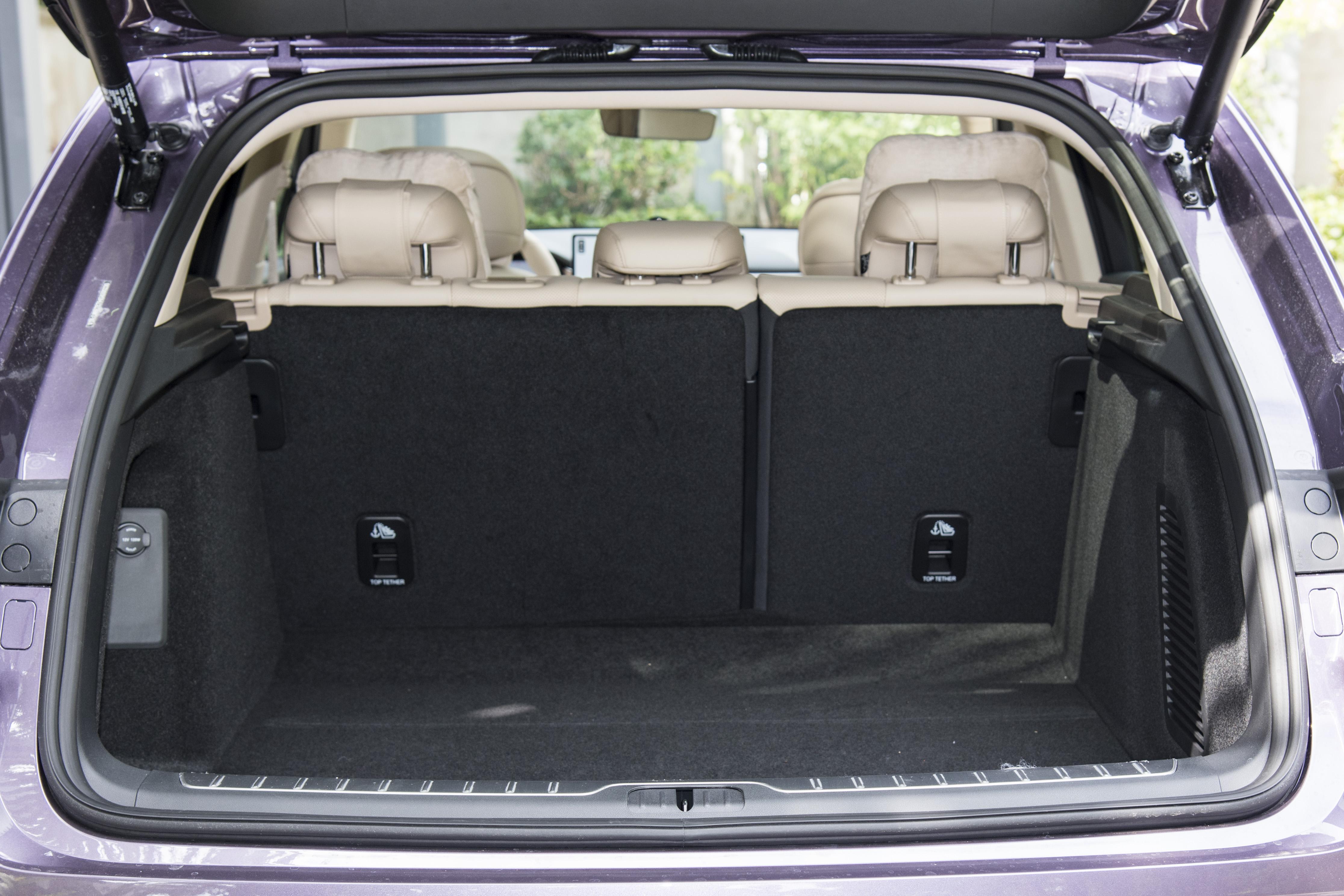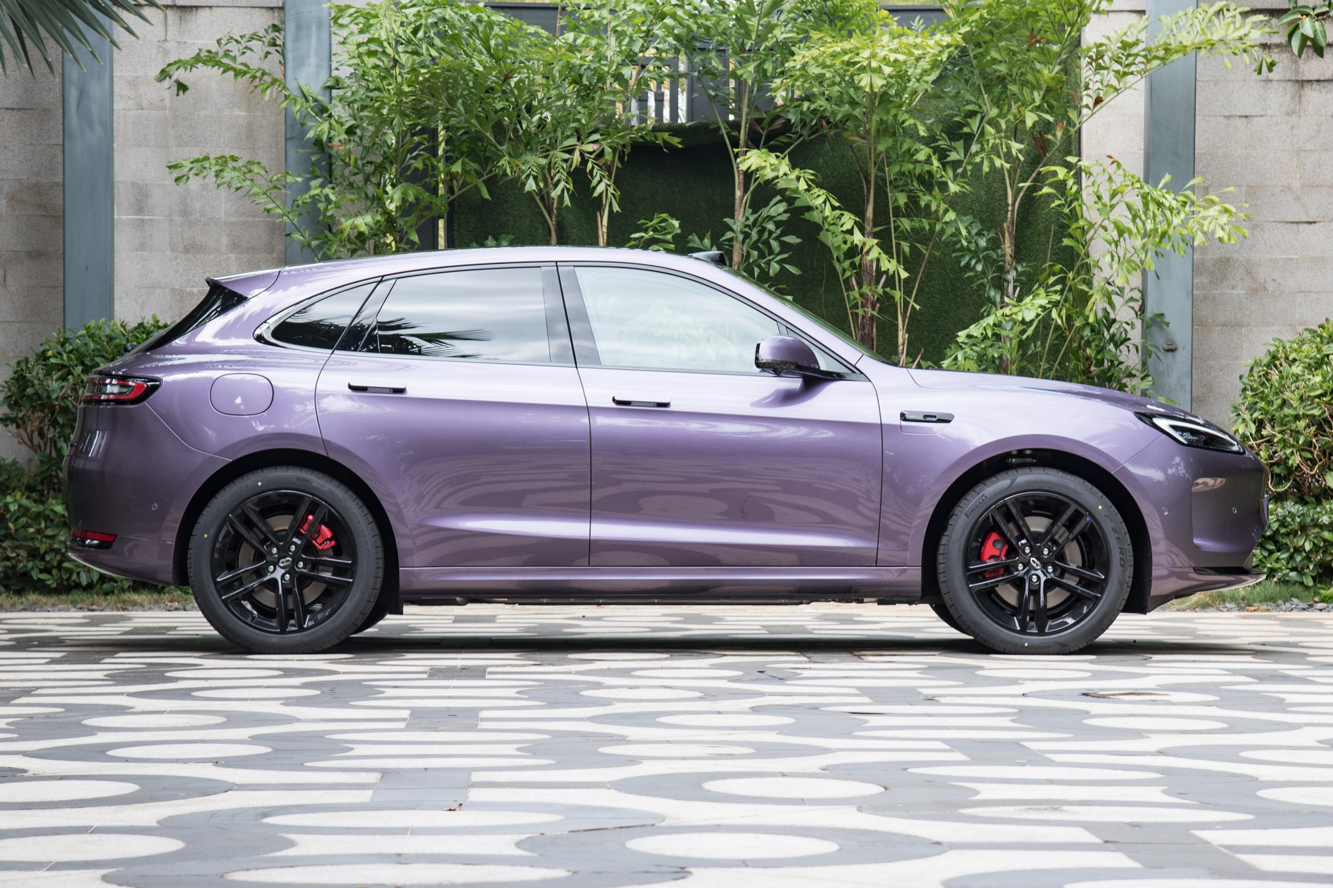 车身侧面呈现出俯冲的姿态,隐藏式门把手的造型不仅能够保障侧面的曲线美,同时还能够降低一定的风阻系数,前/后轮胎厂均为255/50 R19,并采用了黑化的涂装,显得运动感十足。