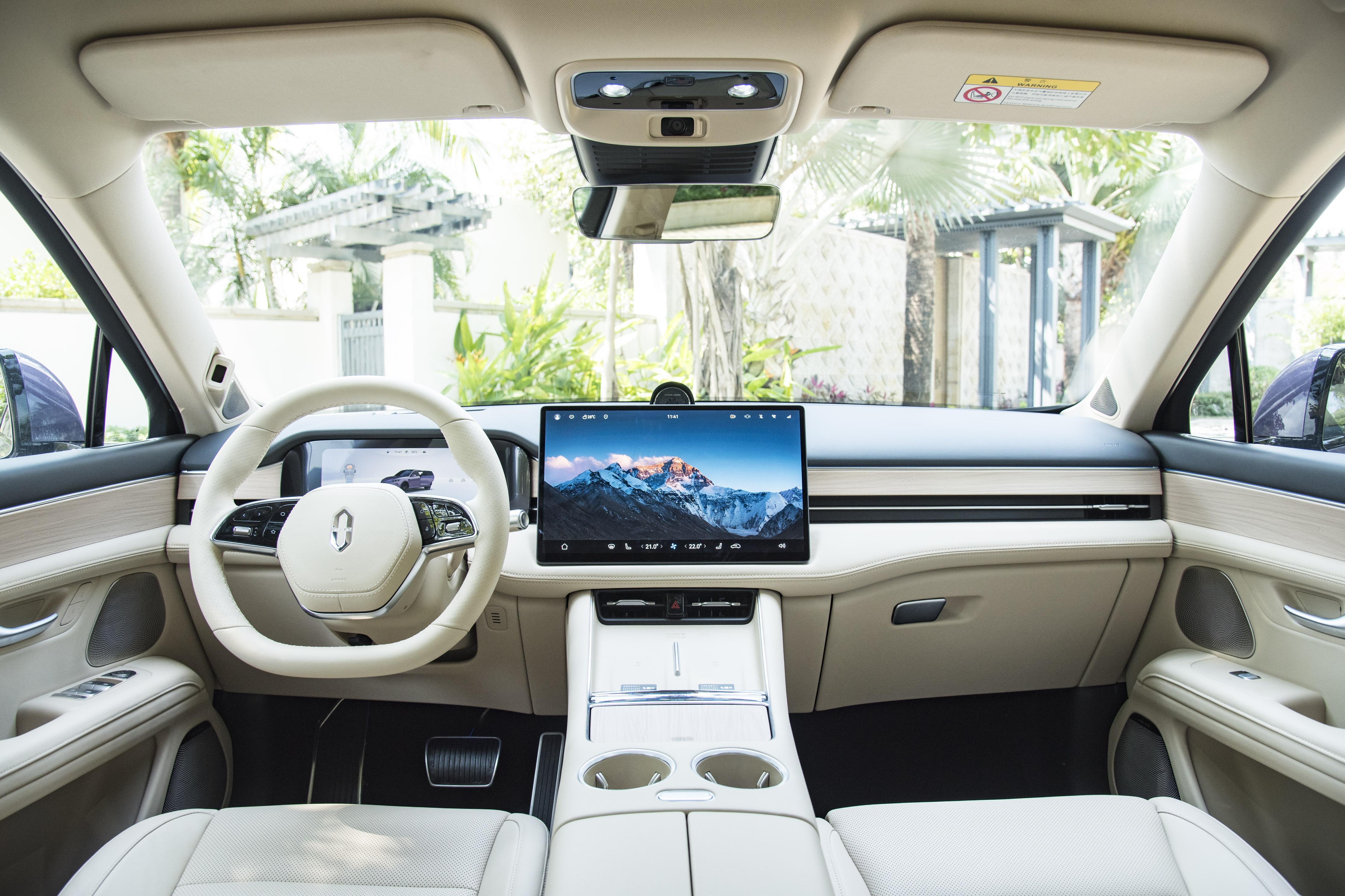 问界M5的内饰采用的是环抱式的设计布局,韶华杏的内饰配色显得较为温馨,加上大面积的皮质包覆和木纹装饰板,比较适合家庭用车,两幅式的多功能平底方向盘采用真皮的材质,10.25英寸的全液晶仪表盘+抬头显示系统(HUD)可以提供丰富的行车信息,而且能够将行车信息投射到前挡风玻璃上,与驾驶员的视线齐平,提升了驾驶安全性,中控台则搭载的是一块15.6英寸的液晶屏幕,同样配备的是HarmonyOS车载智能系统,在智能化的表现基本上是与阿维塔07保持了一致。值得一提的是,前排扶手处的2个USB/Type-C多媒体接口的最大充电功率达到了100W,对于手机充电是非常快的,同时,车内还带有车载空气净化器以及AQS空气质量管理系统等功能,可以看出,问界这个品牌对于车厢内的空气质量做得还是比较出色的。