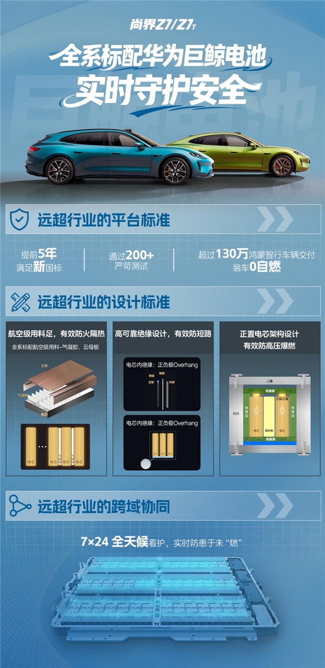 对新能源车型而言,电池安全任何时候都是重中之重。尚界Z7搭载的华为巨鲸电池,给出的安全方案,核心就在于层层设防,单电芯热失控隔离,确保万无一失。