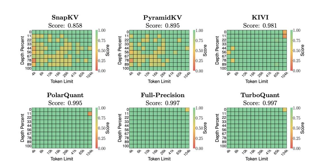 实验结果的亮点集中在几个方面。在“大海捞针”(Needle-in-a-Haystack)测试中,TurboQuant 在将 KV 缓存压缩至少 6 倍的情况下,取得了与未压缩基线完全一致的 0.997 分,而此前广泛使用的 KIVI 方法在同等压缩条件下得分为 0.981,SnapKV 和 PyramidKV 等 token 级剪枝方案的表现则更弱。