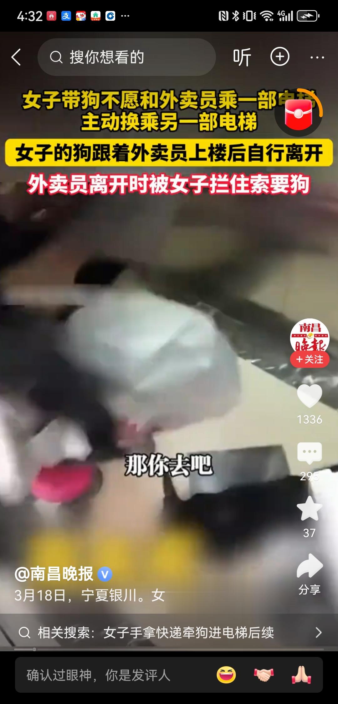 3月18日,银川。女子带狗不愿和外卖小哥同乘一部电梯,主动换乘另一部电梯后,女子的狗跟着外卖小哥上楼后消失,女子拦住外卖小哥索要狗,外卖小哥:遛狗不牵绳狗,乱跑还怪别人!(来源:中安在线)