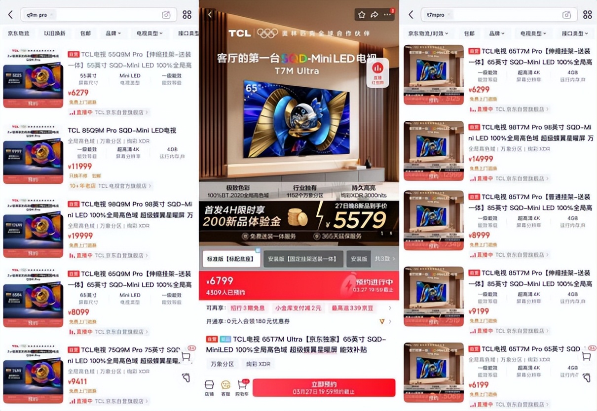 而时隔不过两月,TCL再次打出了一记让人猝不及防的“大惊喜”,去年TCL累计卖爆60万台的Q9和T7系列又有新动静,不少人发现TCL三款新品Q9M Pro、T7M Pro以及T7M Ultra已上线主流电商平台并全面开启预约,据了解TCL将于3月17日(周二)举行SQD-Mini LED电视春季新品发布会。而且眼尖的朋友们已经发现了,Q9和T7系列全部进阶为SQD-Mini LED电视,并且有不少尺寸段直接就是万元内的价格,这种技术下放的效率和实力,TCL的技术储备真是深不见底,这不,SQD的普及元年可不就是了。