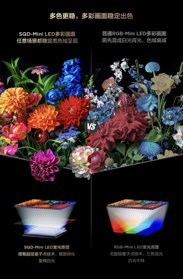 大家都知道买电视的核心需求始终是好画质,而好画质的铁律便是满足高对比度、高峰值亮度、高色域的“画质铁三角”,多数电视只能做到单点或两点出彩,SQD-Mini LED技术是实现三项全能的终极解法,这也是为何越来越多专业人士认可:“真正好画质认准SQD电视”这条选购标准,而这项核心优势也完整承袭到了三款新品上。