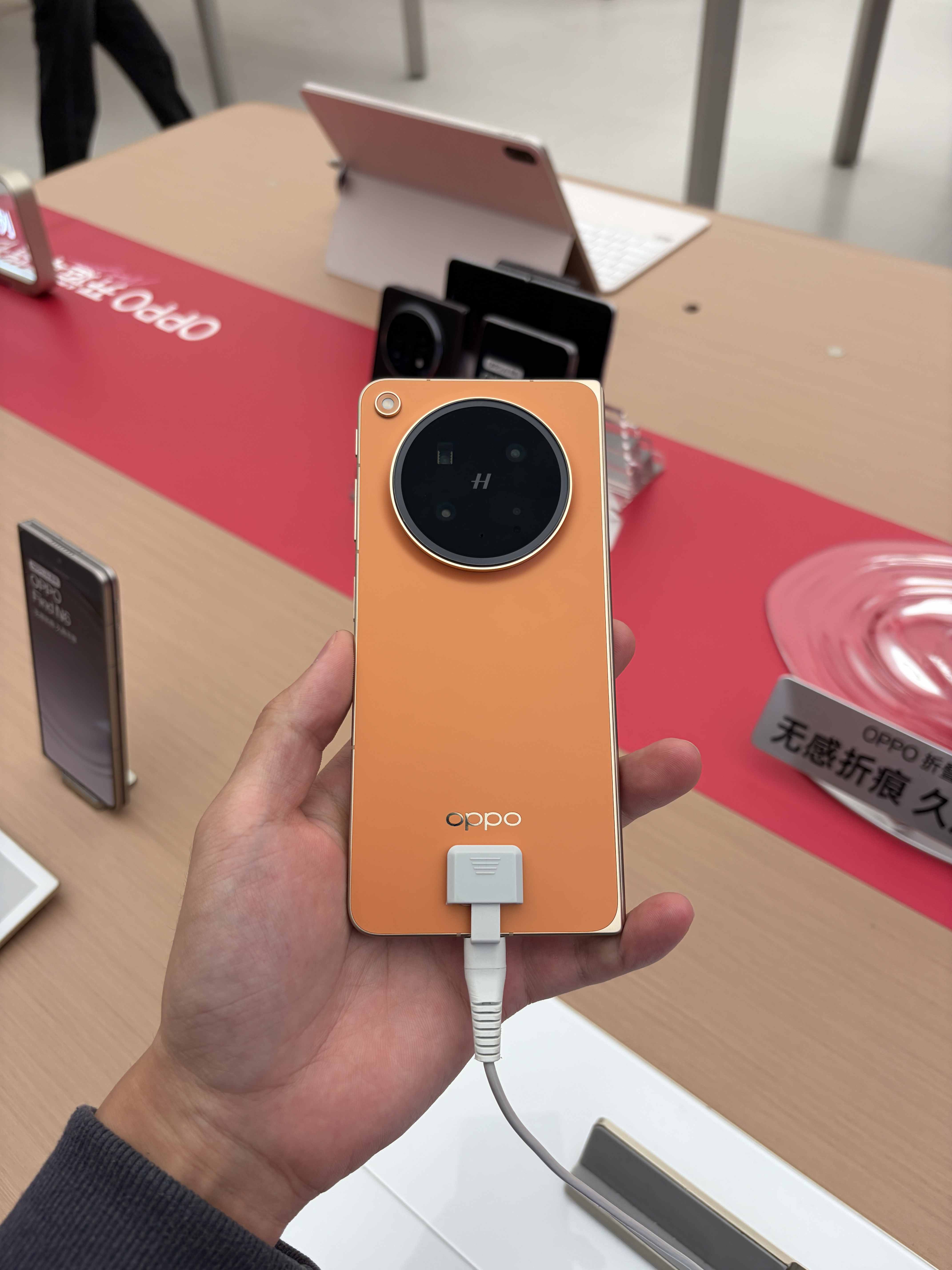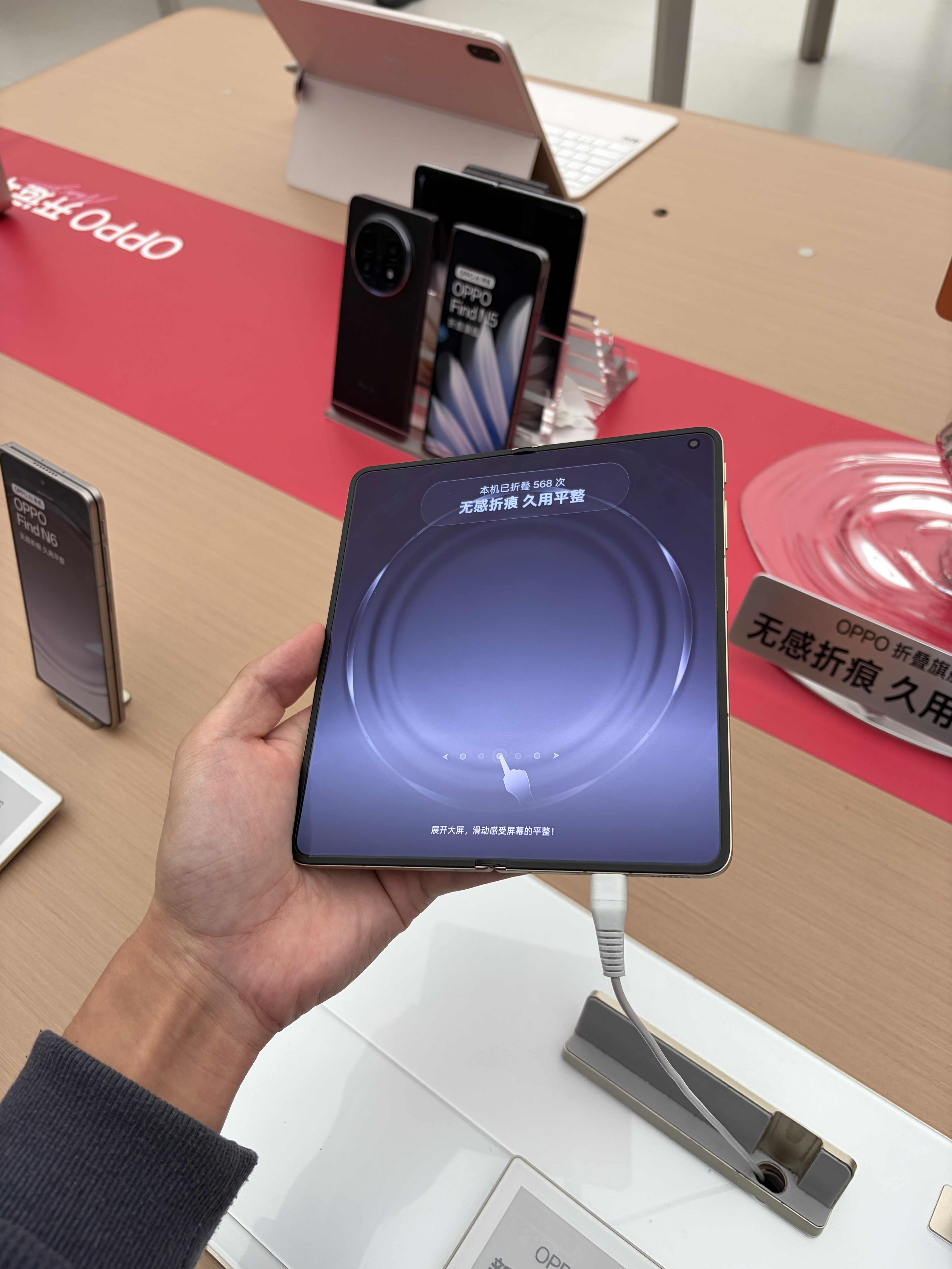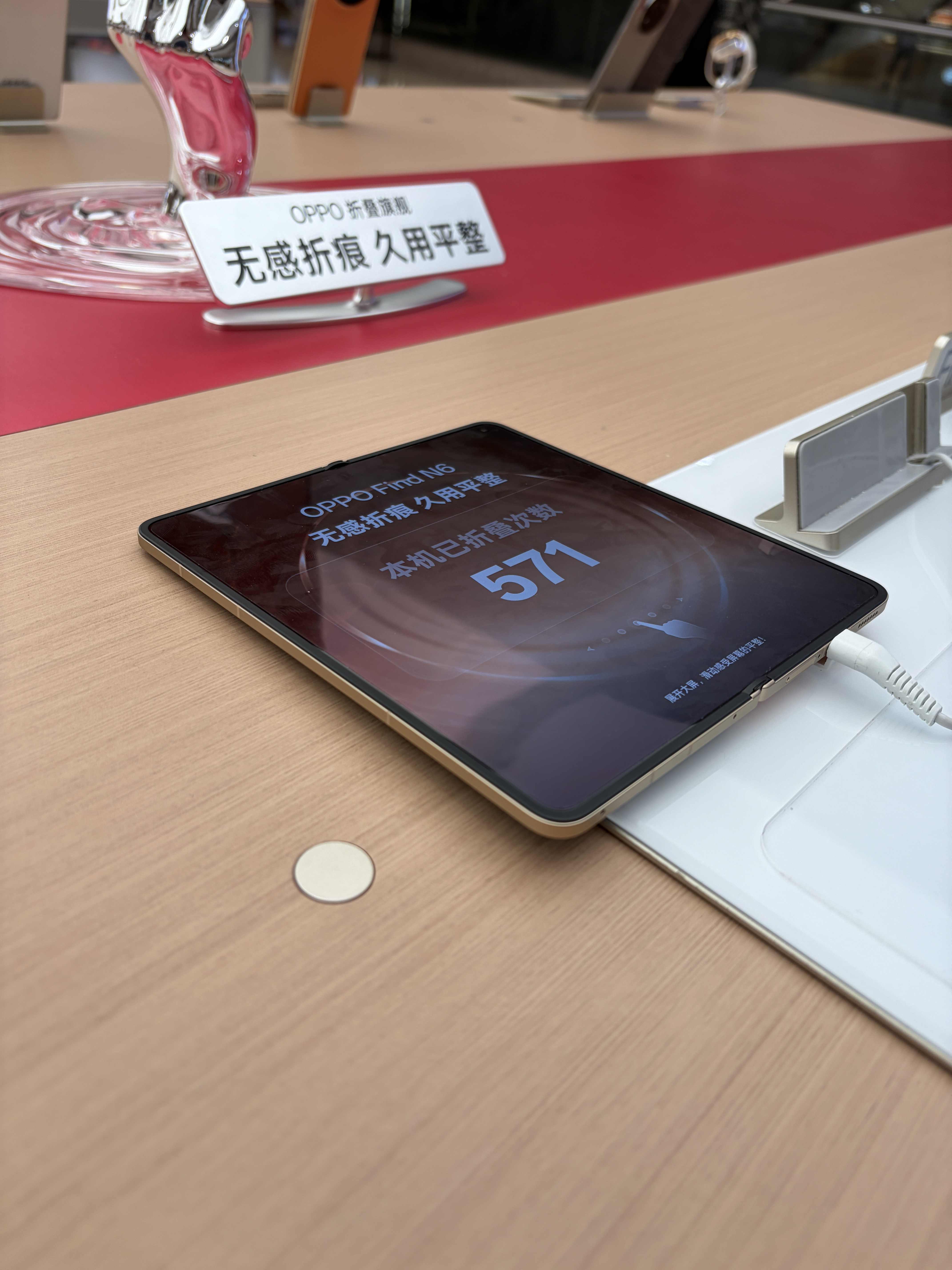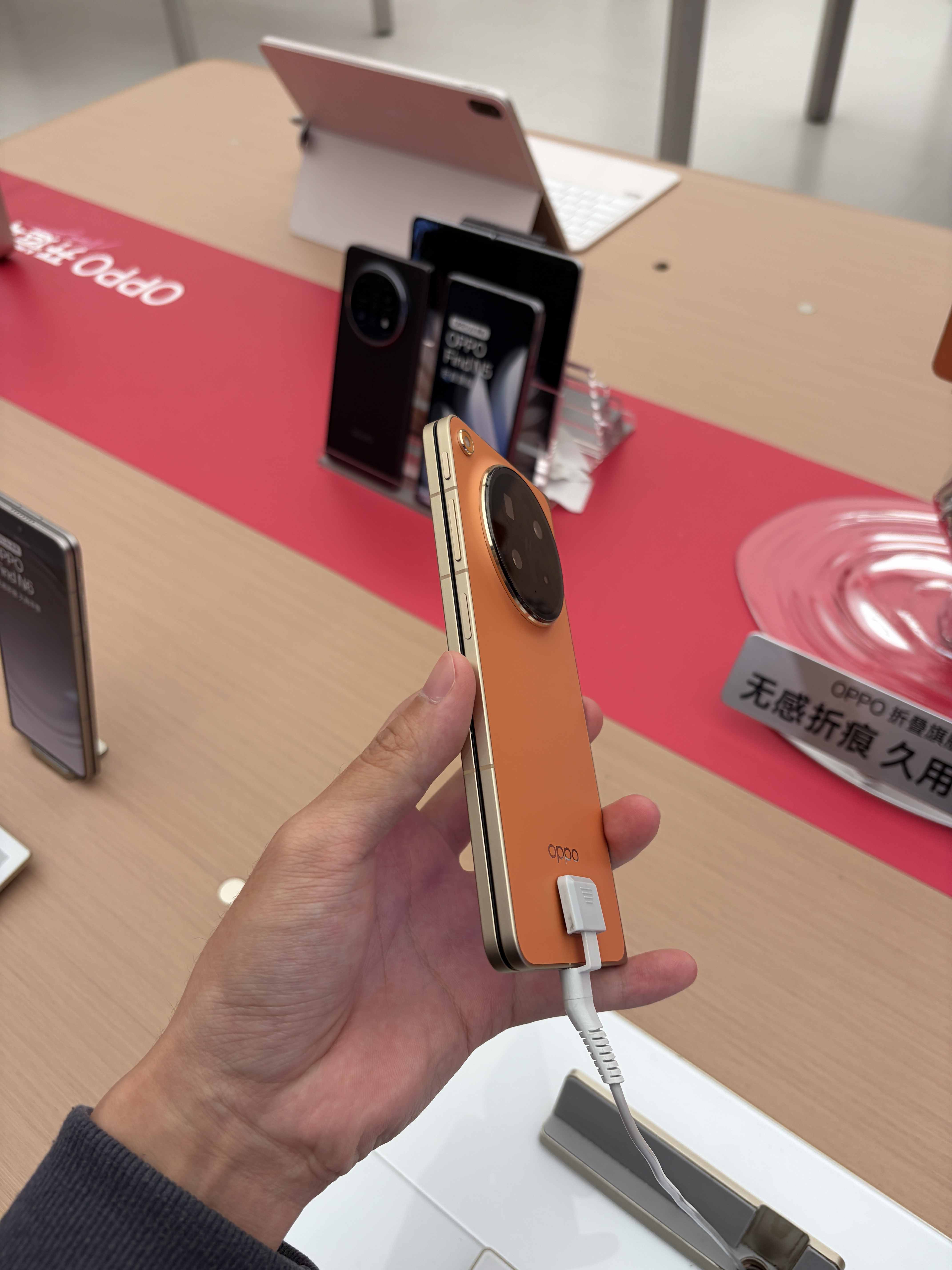 说回这台折叠屏,手感还是挺轻薄的,跟隔壁摆的上代OPPO Find N5差不多,而且质感有提升,包括镜头什么的都更有精致高级的感觉。这次的三个配色里我最喜欢橙色(买的话估计也是首选这个),不是🍎那种很艳的橙色,偏淡一点,可能像爱马仕橙?🤣然后边框是淡金色的也很搭折痕肯定是这次新款的重头戏了,之前看网上各种博主的视频还以为是统一营销话术,实际我自己看的话确实Find N6就是目前最平整的一款折叠屏,包括看和摸都感受不到折痕的存在,而且我看的这台都被折过五百多次了也是很平整,应该不会像以前的折叠屏一样用个半年一年的中间痕迹就很明显~也跟店员打听了下说这次Find N6可能会比前代涨2000,不过折痕、拍照、性能什么的都升级挺大的,值不值看个人,我是能接受的~比较蛋疼的就是这个门店说橙色和钛色基本都被订完了,黑色好看是好看,就是我有点用腻了,估计只能等等上市后过几天看看