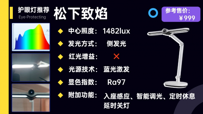 一句话推荐:拥有三分钟“红光”增益,为眼睛输送更多的“营养”;同时拥有OCLT光透镜技术,打造出99.6%还原太阳光的高品质光源,达到护眼更养眼的效果。
