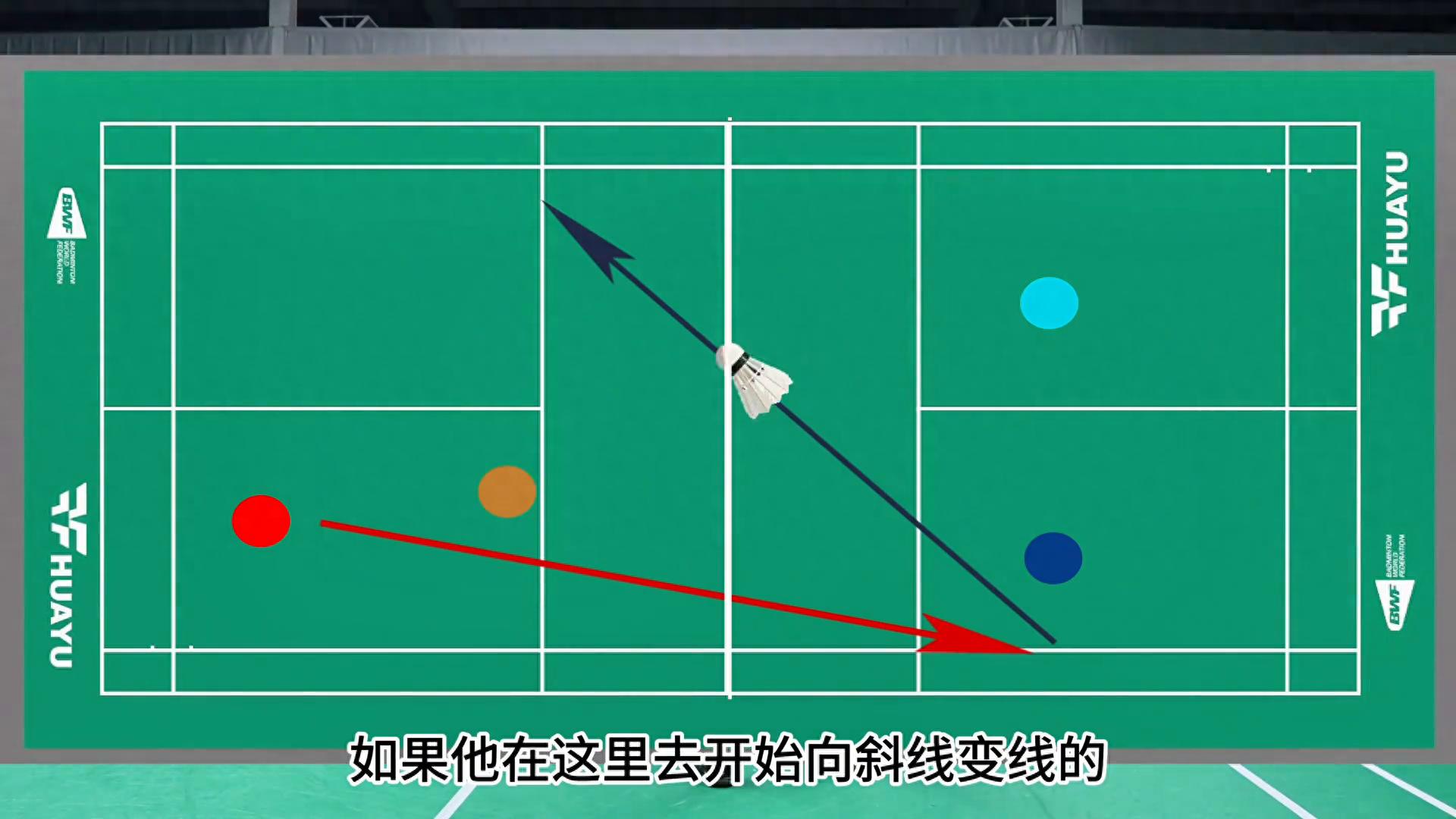 如果他在这里去开始向斜线变线的,那他的过网点是在这,那这是我搭档可以够到。这样对手变线难度将会大大增加,我的队友的位置也被我保护住了。