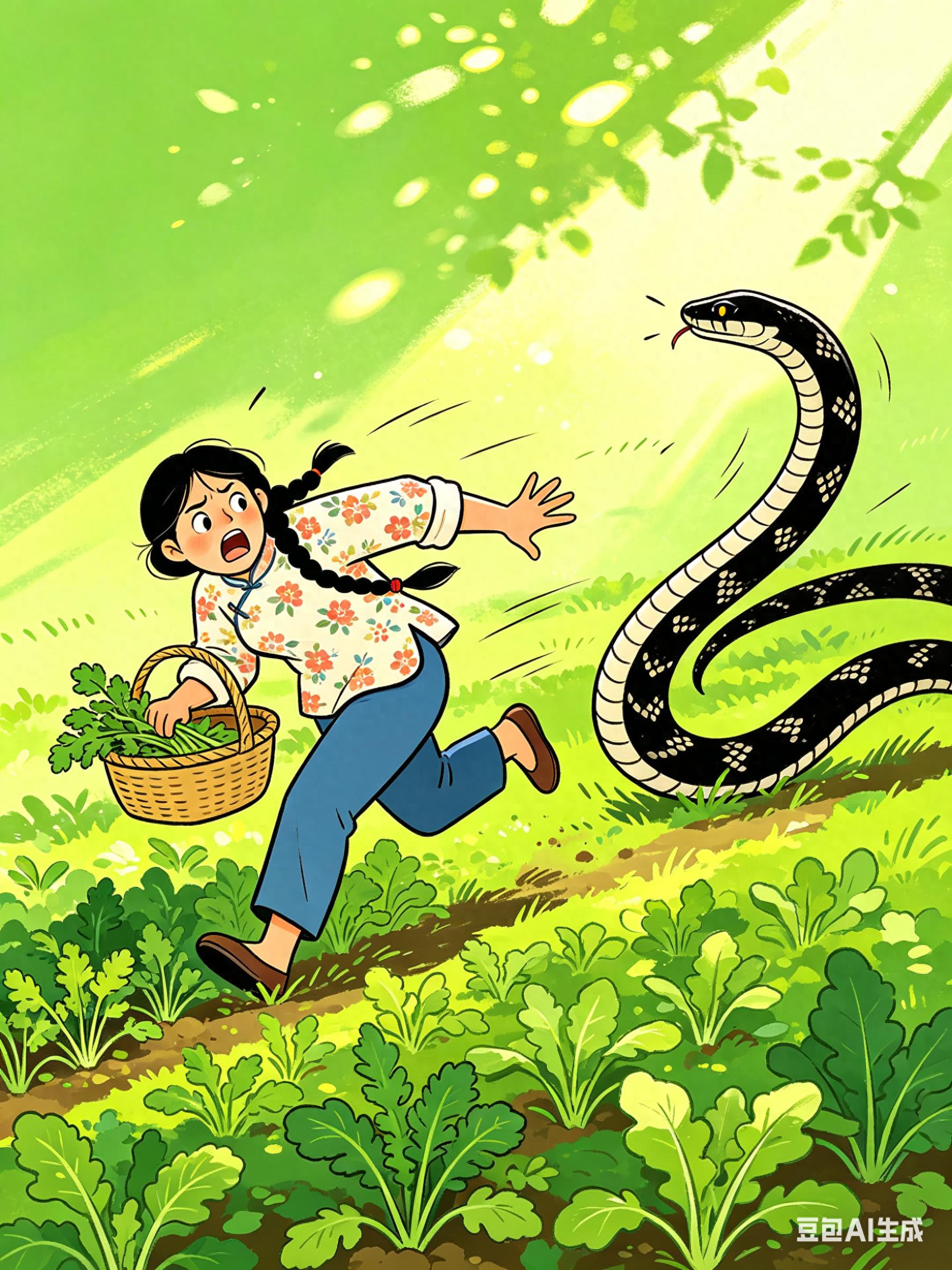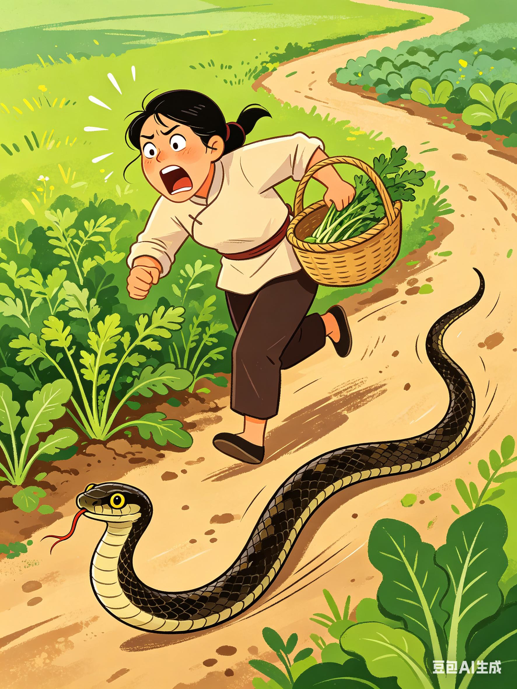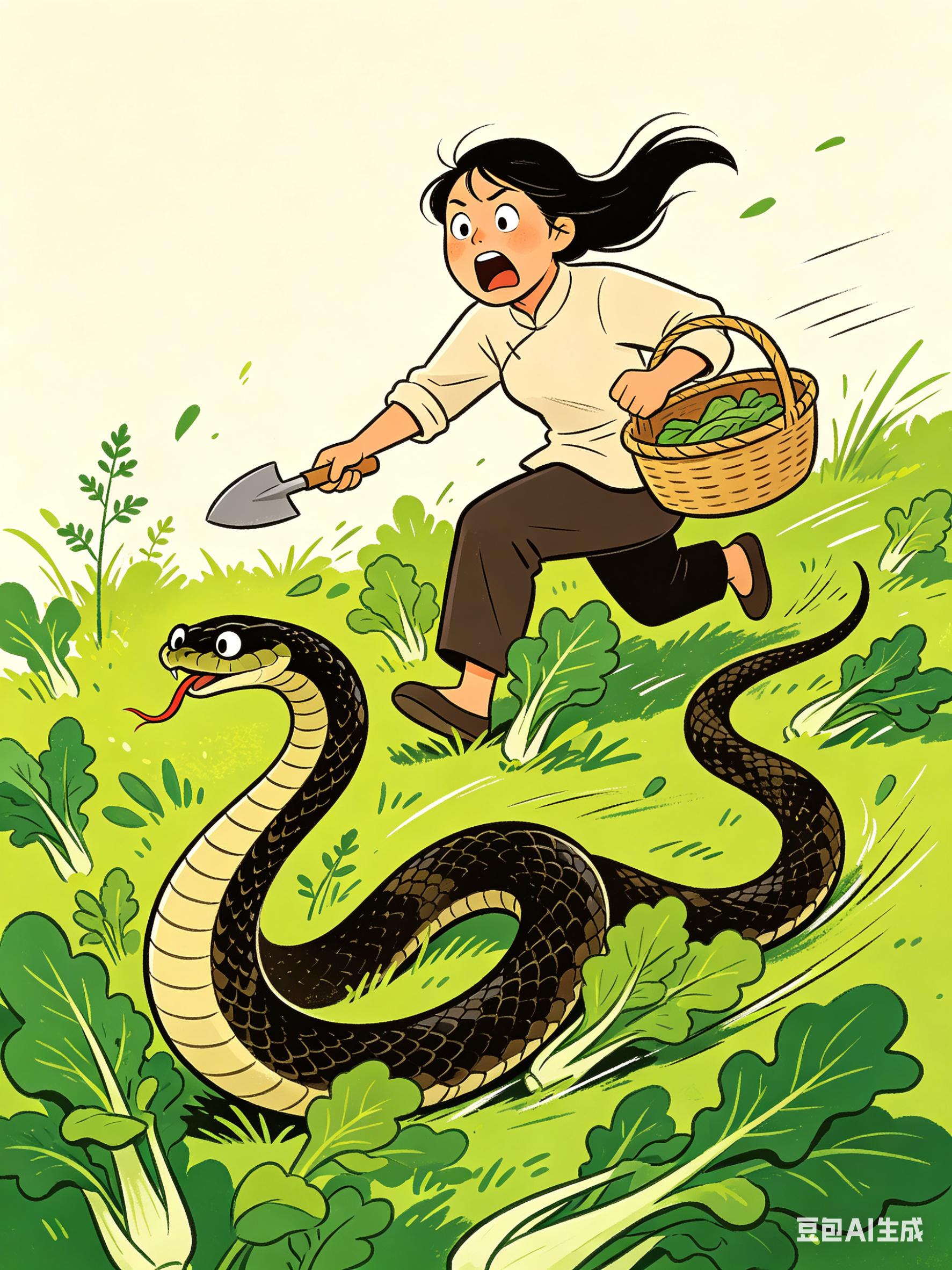 当天天气晴好,女子和朋友分开采摘。她蹲在草丛里挖野菜,一抬头就看到一条大蛇近在眼前,当场吓得尖叫,连滚带爬往坡下冲,慌乱中还摔了一跤,场面十分狼狈。