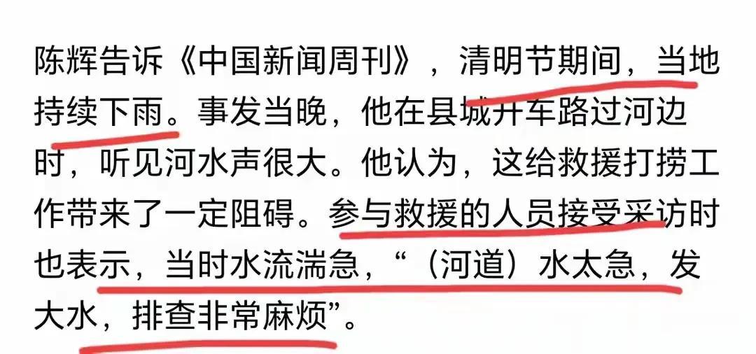 事发当晚雨大得厉害,河水涨得很高,给救援带来了极大困难。