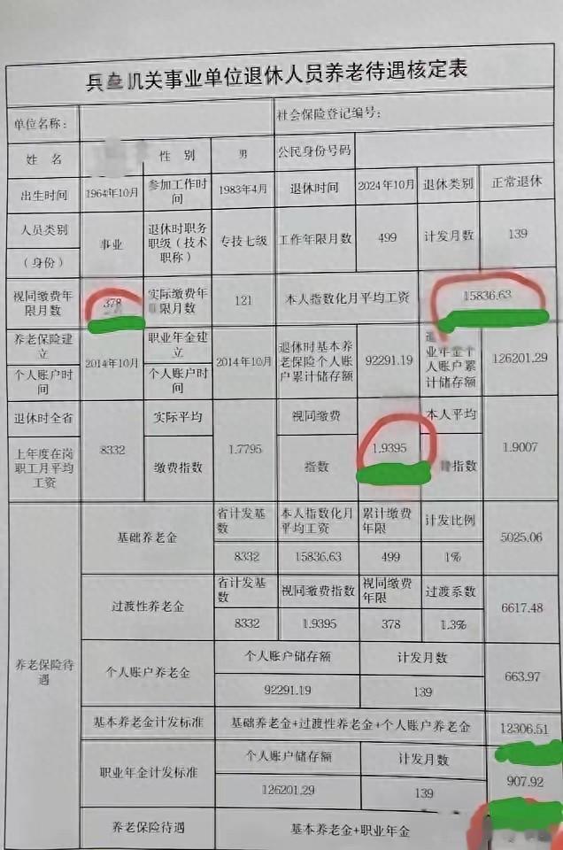这是一张新疆事退人员养老金核定表。这就不难理解为什么工龄长达41.58年,个人账户储存额只有92291.19元。这位友友83年4月参加工作,退休时职务职级是专技七级,视同缴费指数是1.9395。视同缴费年限长达378个月折合成年是31.5年。2014年10月开始缴纳社保,实际缴费年限只有121个月折合成年是10.08年,个人账户储存额是92291.19元,实际平均缴费指数是1.7795。本人平均缴费指数是1.9007。当地计发基数是8332元,60岁退休计发月数是139。
