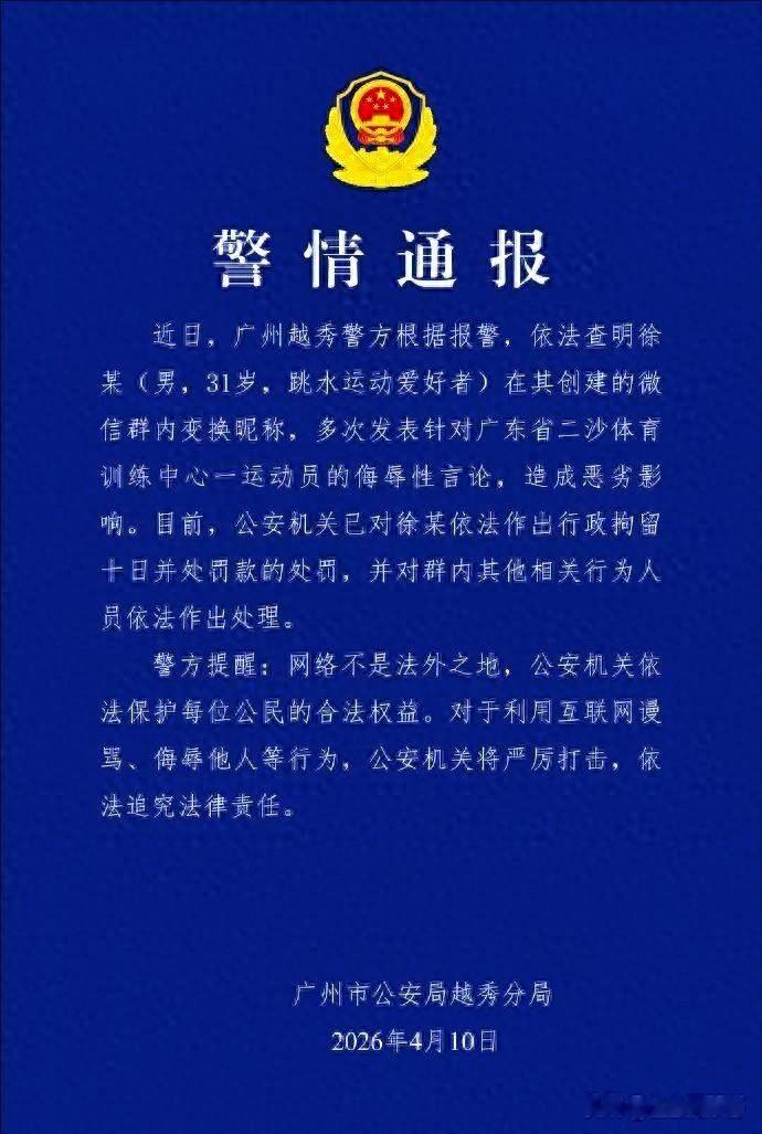 一个31岁的男子,在自己建的微信群里,多次换着昵称辱骂运动员,说话特别难听,结果直接被依法行政拘留10天,还罚了款。群里跟着起哄的人,也一并被处理。