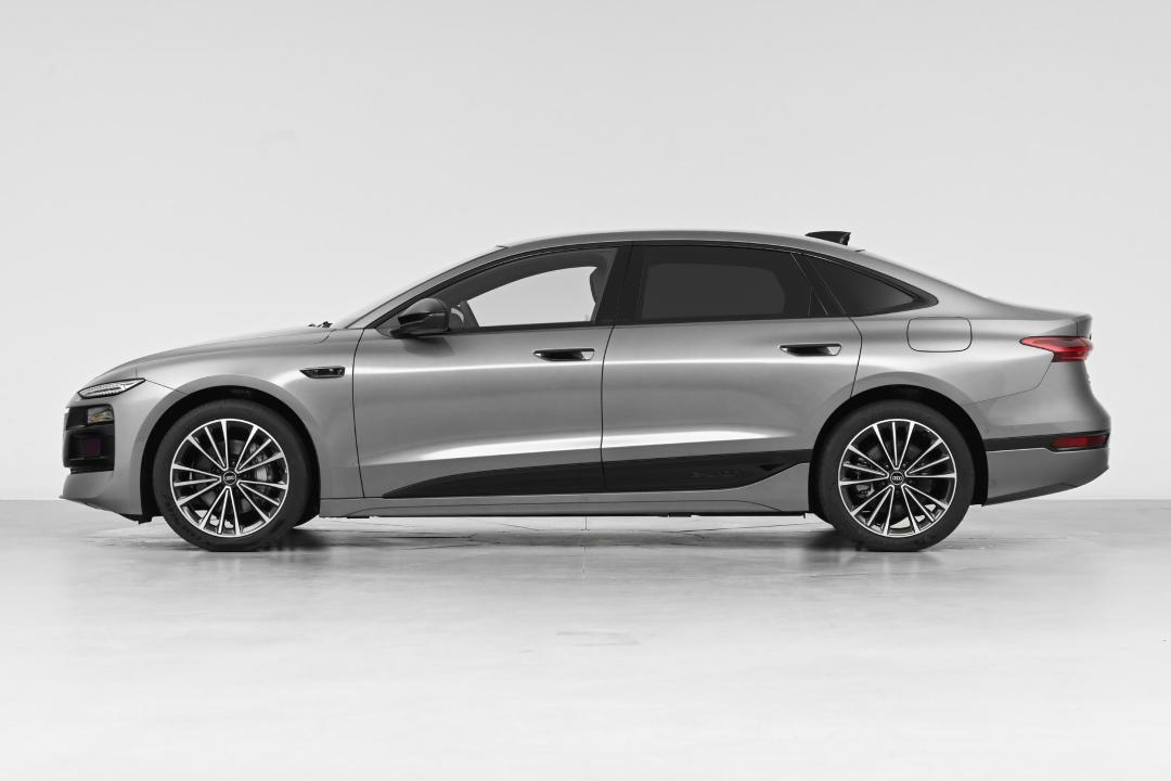 从侧面看,A6L e-tron的线条也要比燃油版本流畅不少。由于纯电平台的布局优势,它的前后悬明显缩短,同时还配备了电子外后视镜和半隐藏式门把手,使整车风阻系数降到了0.22Cd。