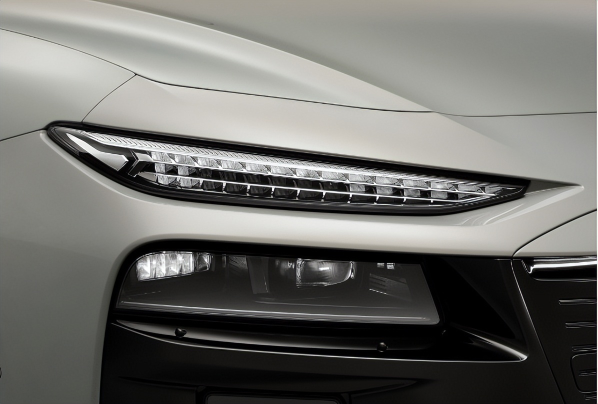 整个前脸呈现出类似倒梯形的视觉效果,同时将两侧的传感器、雷达、大灯组以及下方进气口整合在一起,形成了一个更大,贯穿整个车头的“大嘴”。
